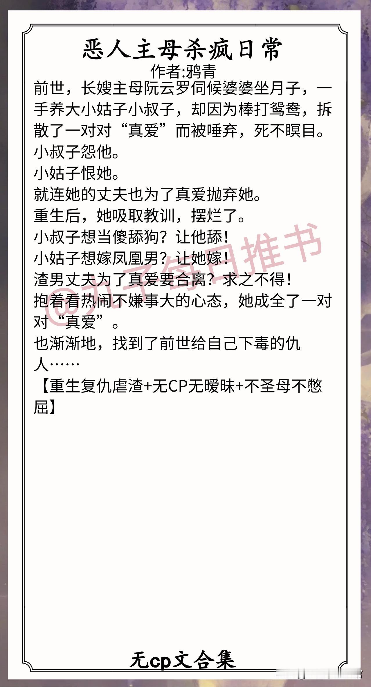 5.《恶人主母杀疯日常》作者:鸦青(清醒主母,重生,复仇虐渣,无cp苏爽文)