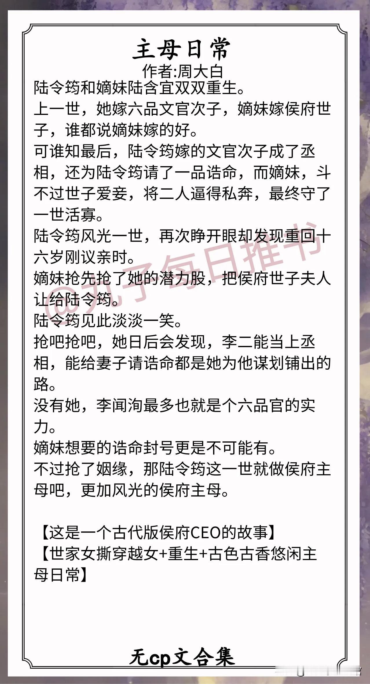 8.《主母日常》作者:周大白(端庄沉稳世家女,重生,高门日常,古代版职场,无cp)