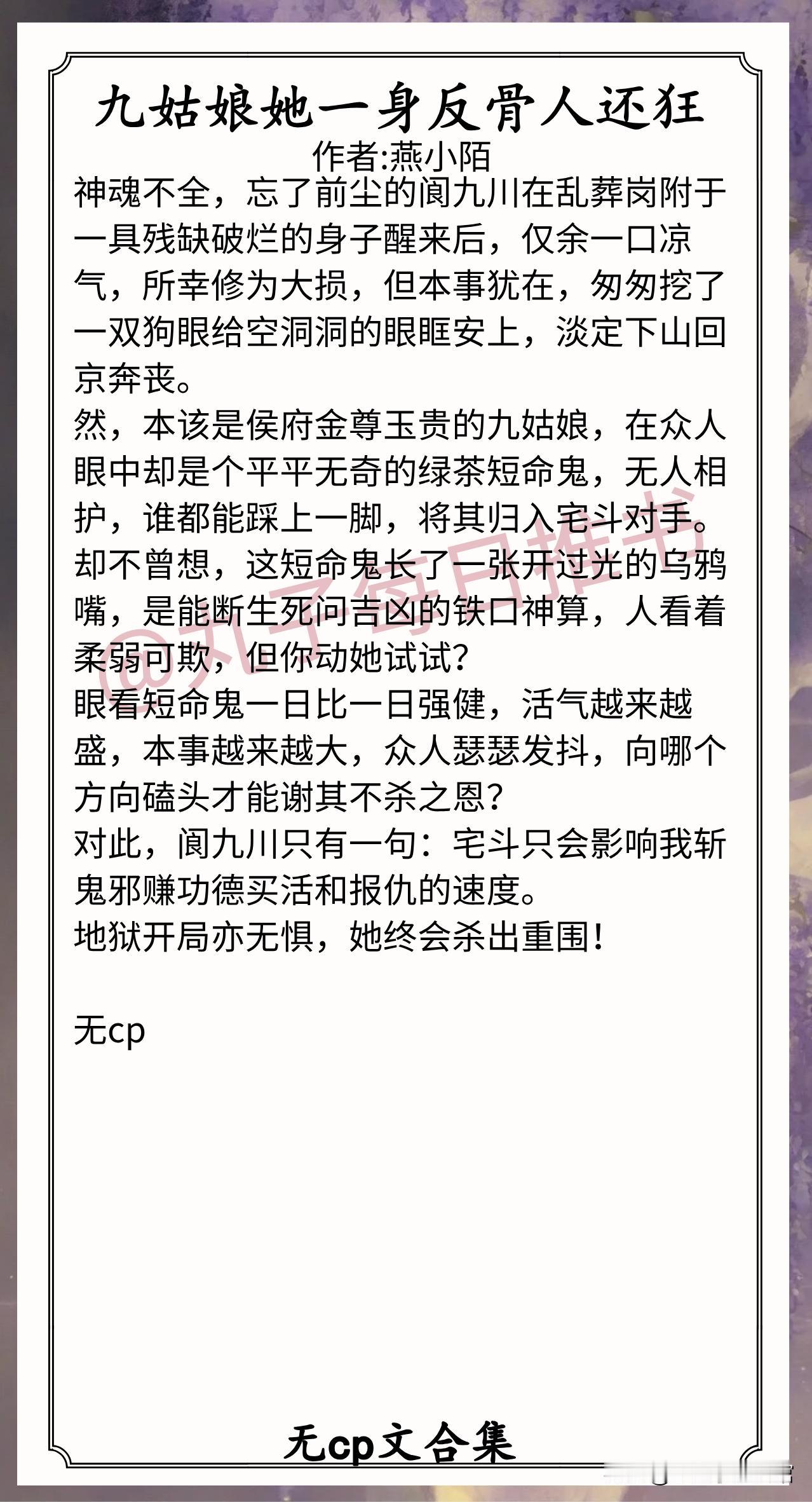 4.《九姑娘她一身反骨人还狂》作者:燕小陌(乡野贵女,打脸虐渣,古言苏爽文,无cp)