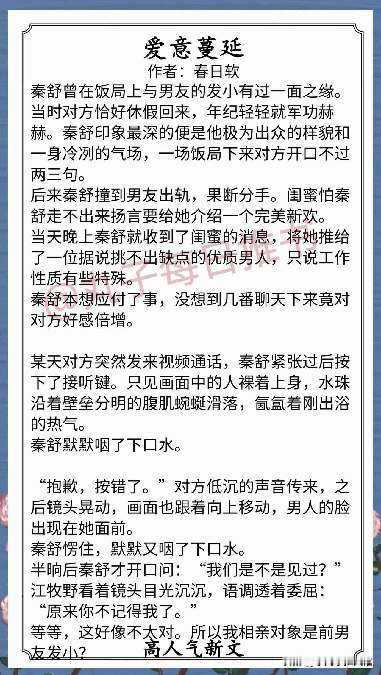 4. 《爱意蔓延》作者:春日软(温柔钓系宠物医生vs假正经高冷陆军少校,先婚后爱,高甜军旅文)