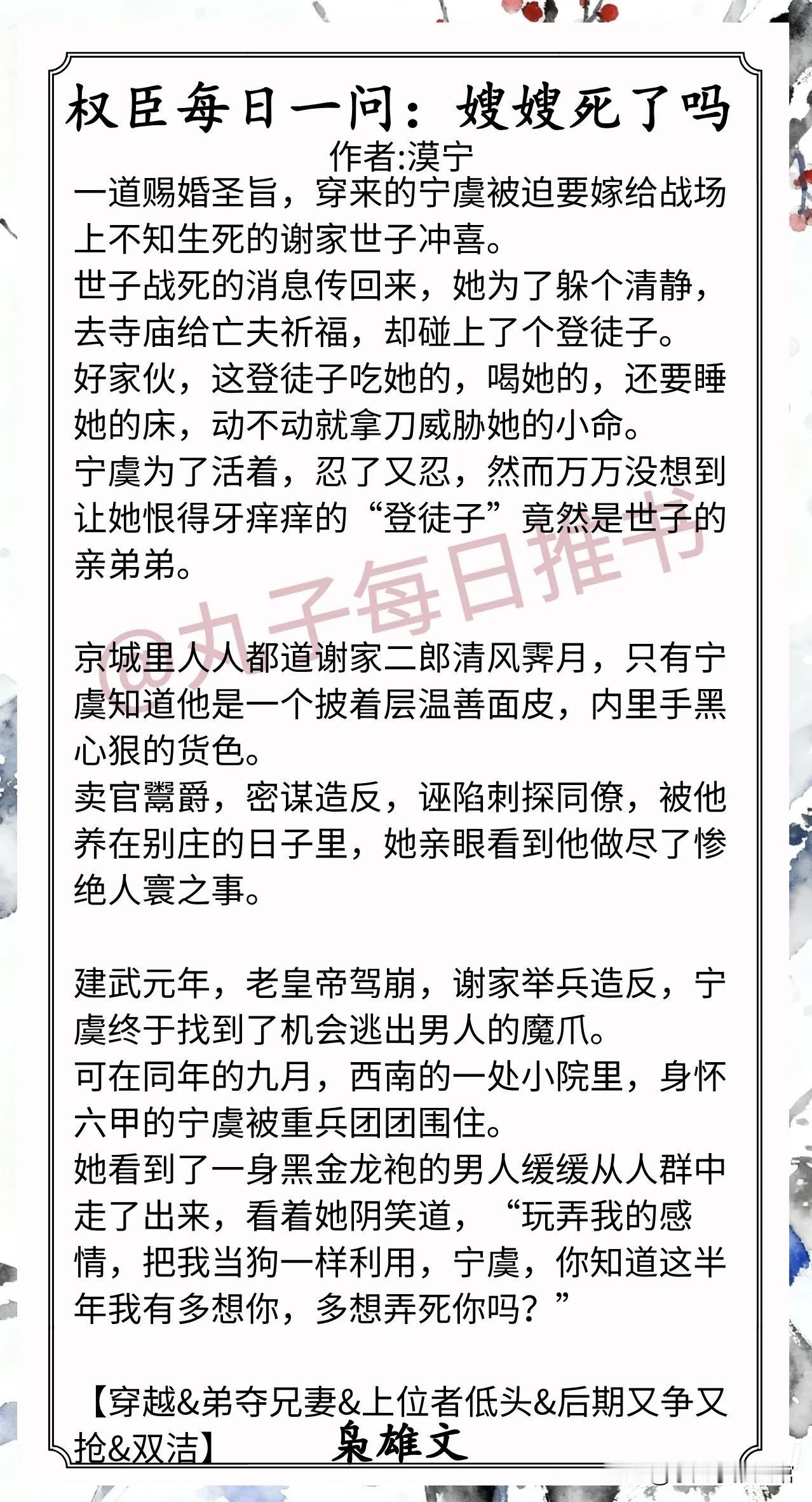 3.《权臣每日一问:嫂嫂死了吗》作者:漠宁(清醒睿智美人vs霸道狠辣枭雄,穿越,打脸真香,弟夺兄妻,上位者低头)
