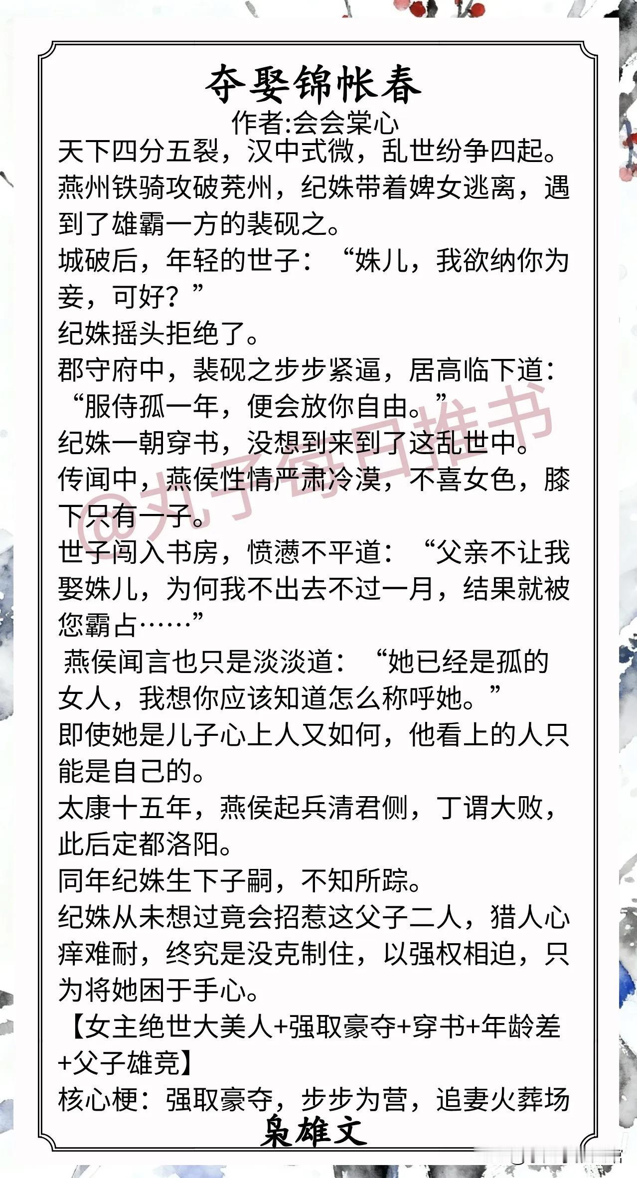 5.《夺娶锦帐春》作者:会会棠心(绝色美人vs霸道枭雄,穿越,强取豪夺,父子雄竞)