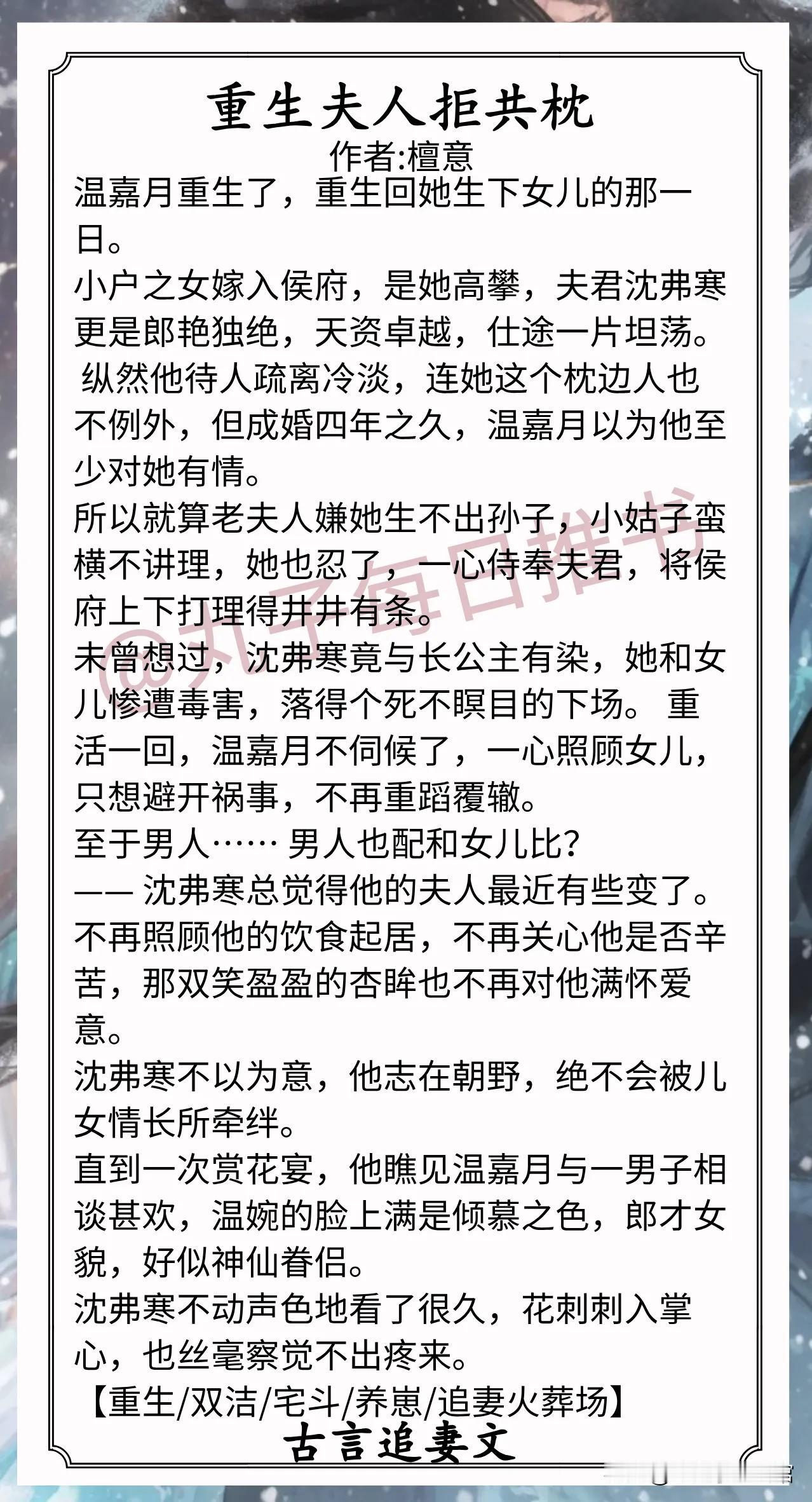 4.《重生夫人拒共枕》作者:檀意(小户之女vs高门公子,重生,婚恋,追妻火葬场)