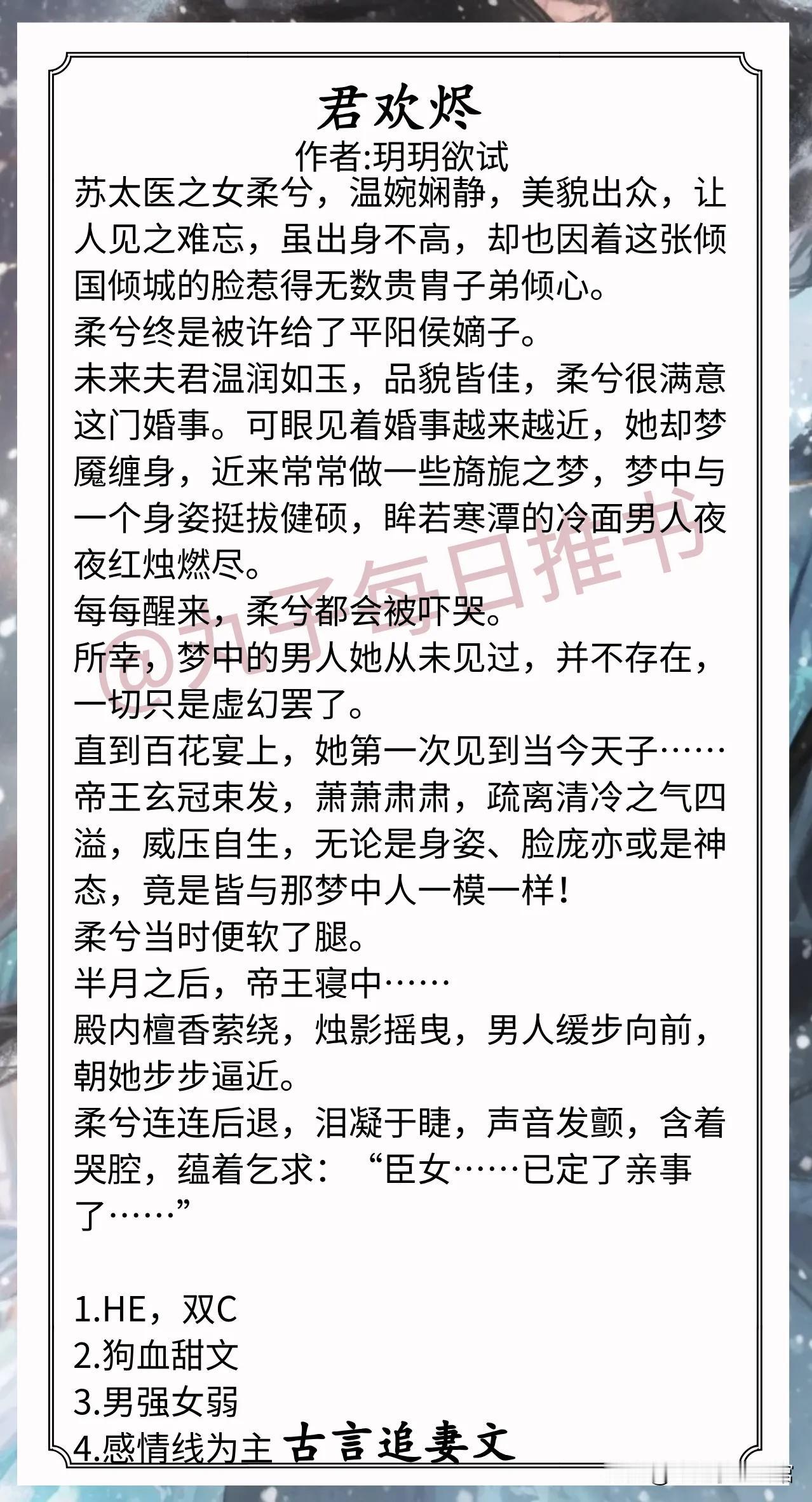 2.《君欢烬》作者:玥玥欲试(柔弱貌美太医庶女vs口嫌体正冷漠帝王,男强女弱,强取豪夺,追妻现场)