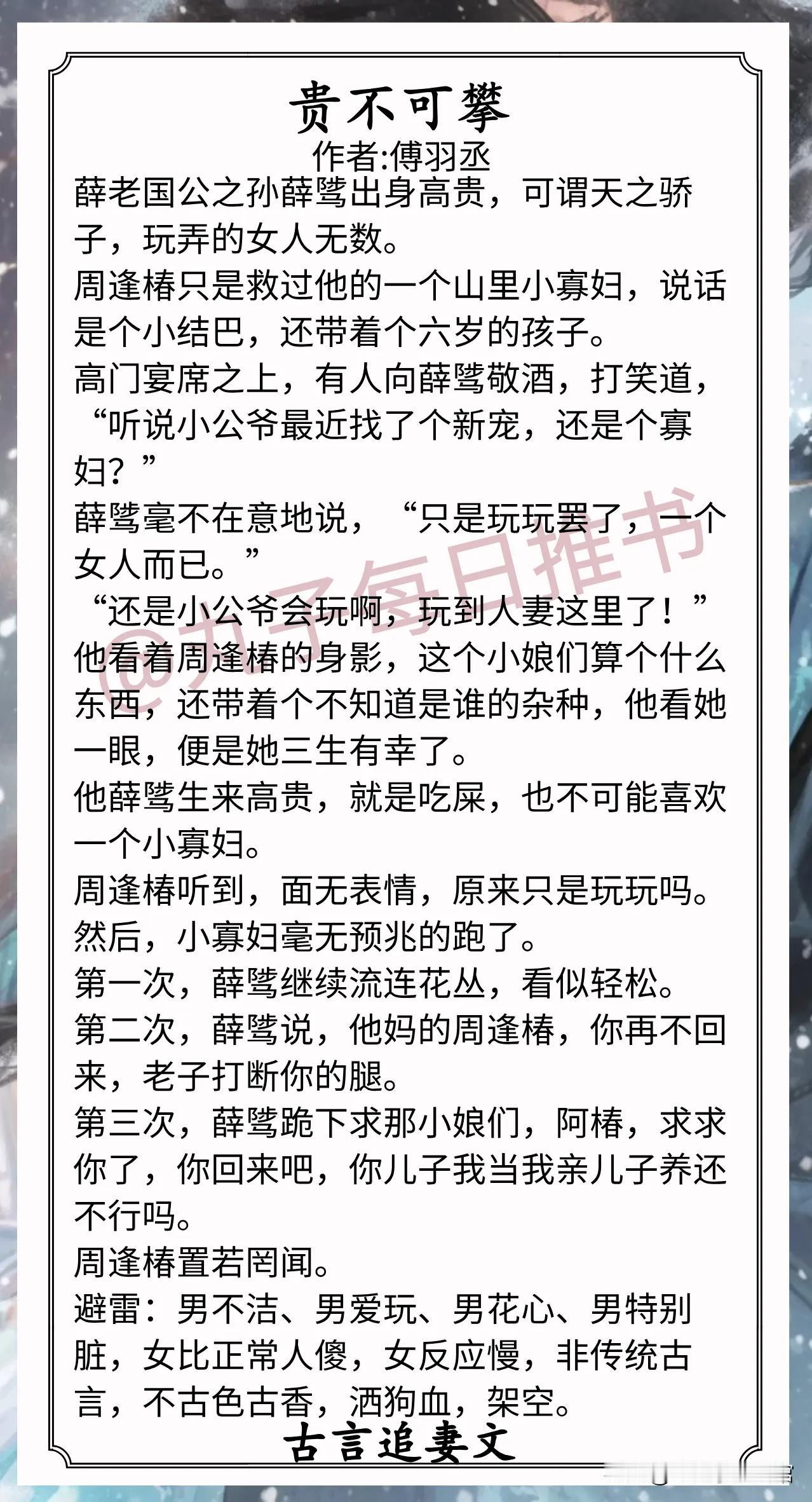 3.《贵不可攀》作者:傅羽丞(坚韧善良社会底层乡野小寡妇vs心口不一天之骄子顶级权贵男,强取豪夺,上位者低头,追妻火葬场 )