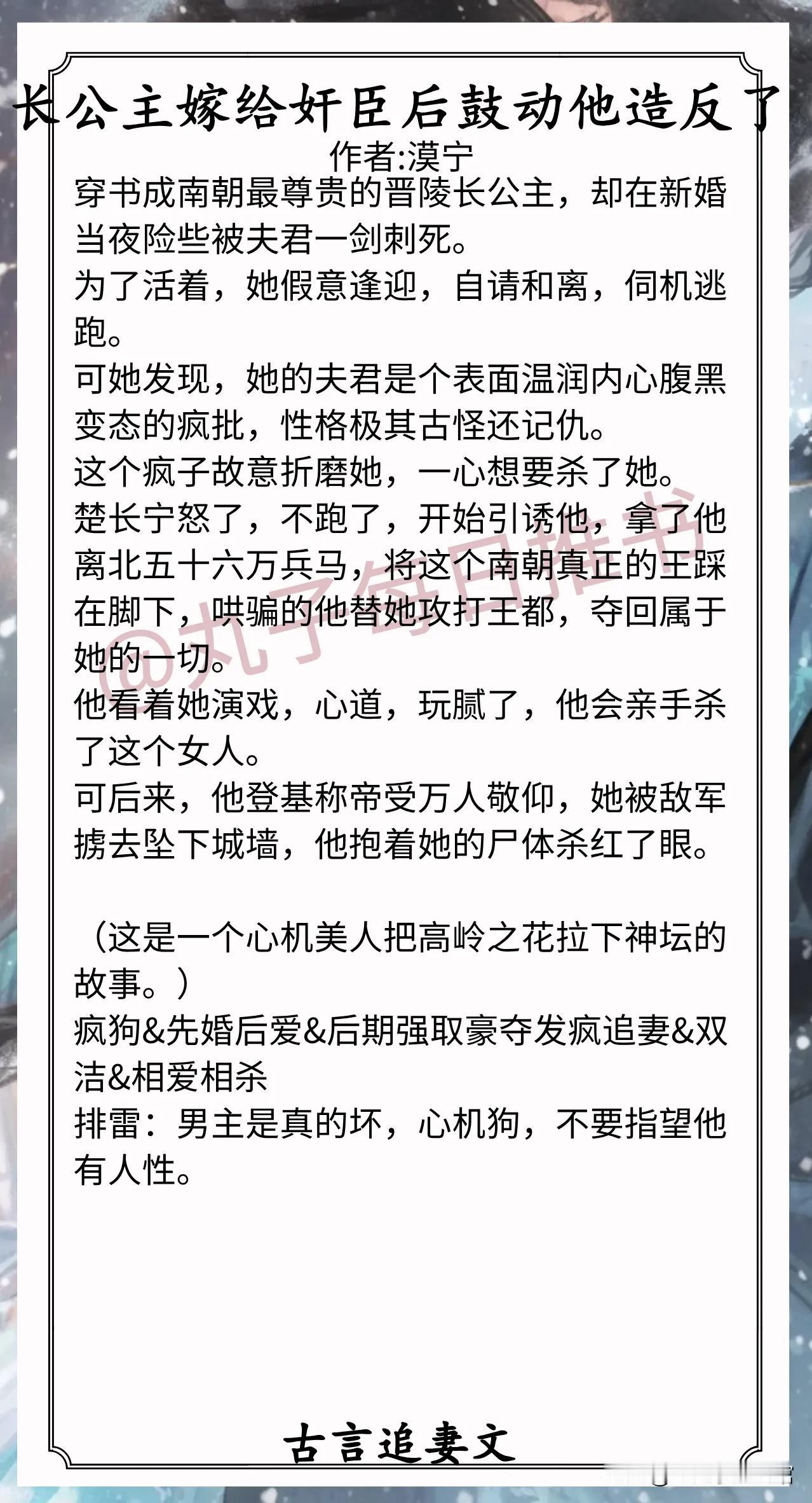 5.《长公主嫁给奸臣后鼓动他造反了》作者:漠宁(心机美人vs高冷疯狗,穿越,相爱相杀,追妻火葬场)