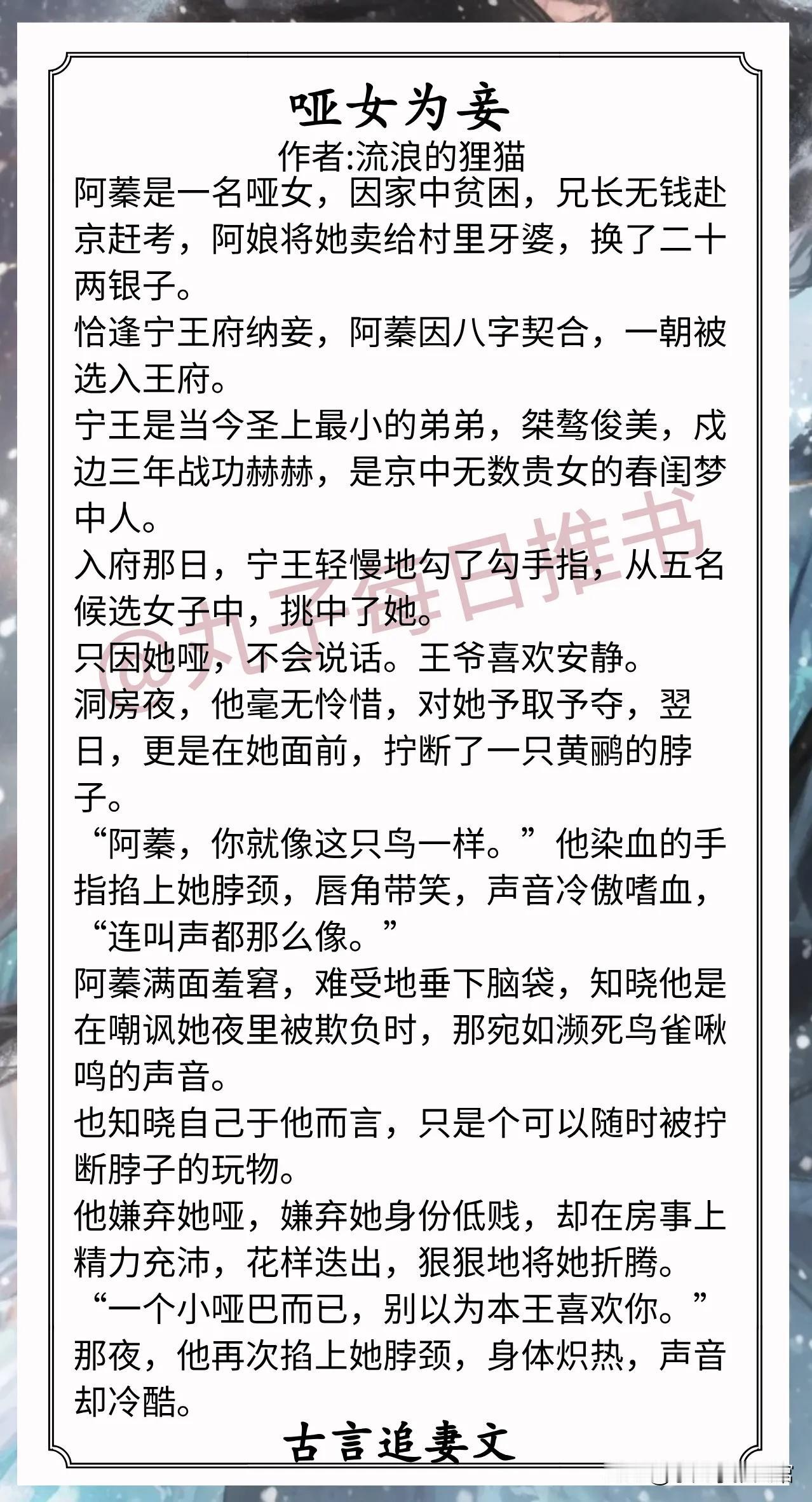 7.《哑女为妾》作者:流浪的狸猫(温软哑女vs高傲王爷,真香,上位者低头)