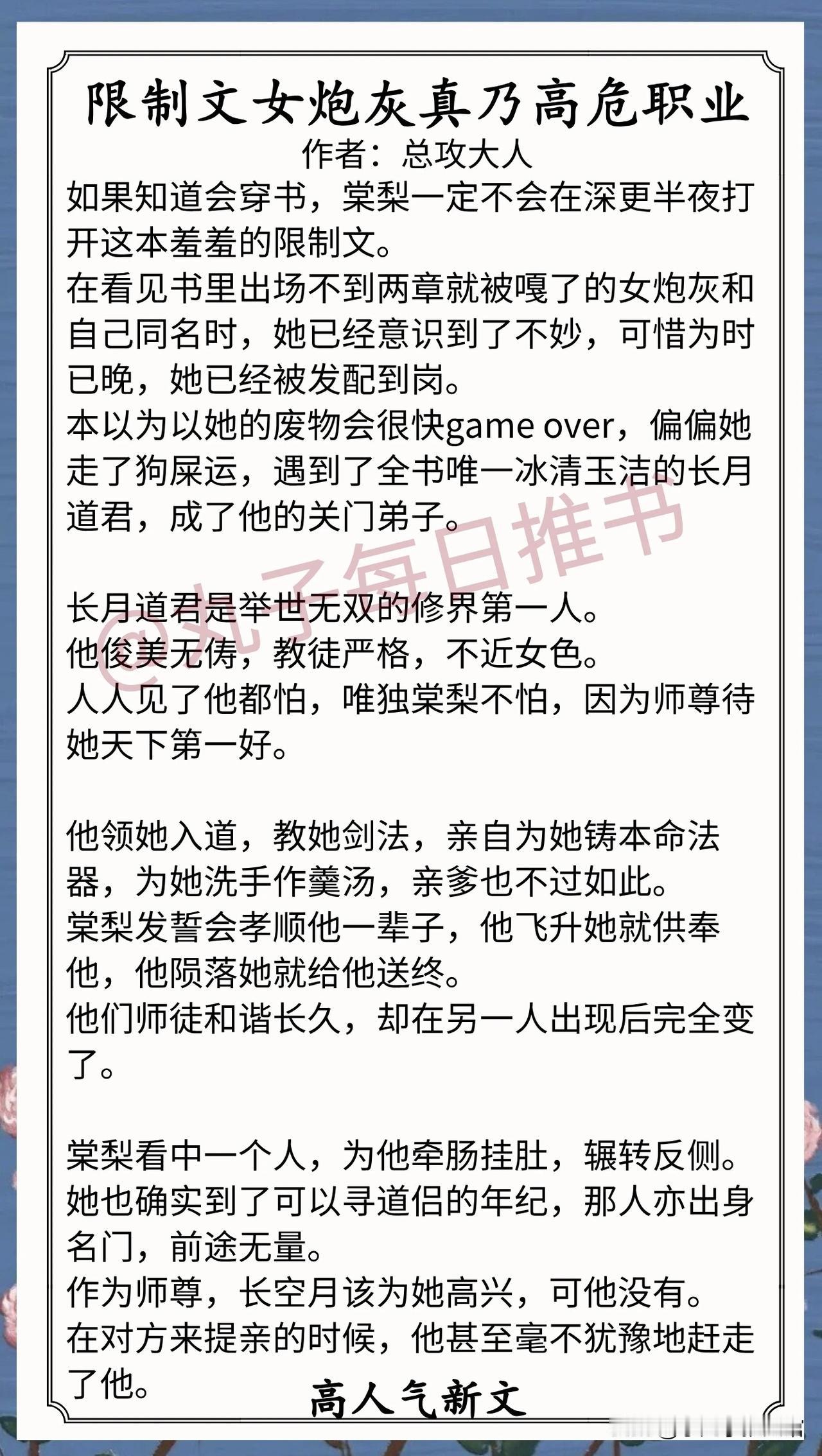 9. 《限制文女炮灰真乃高危职业》作者:总攻大人(娇俏女徒弟vs高岭之花道尊,穿书,强取豪夺,仙侠修真文)小说 推文