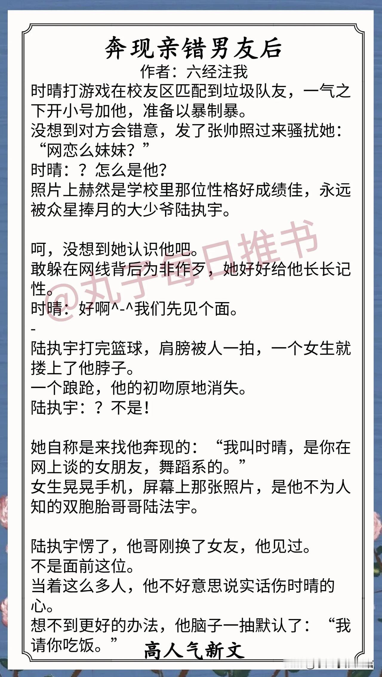 2. 《奔现亲错男友后》作者:六经注我(娇蛮任性大小姐vs热烈恋爱脑小狗,阴差阳错,男宠女,校园小甜饼)