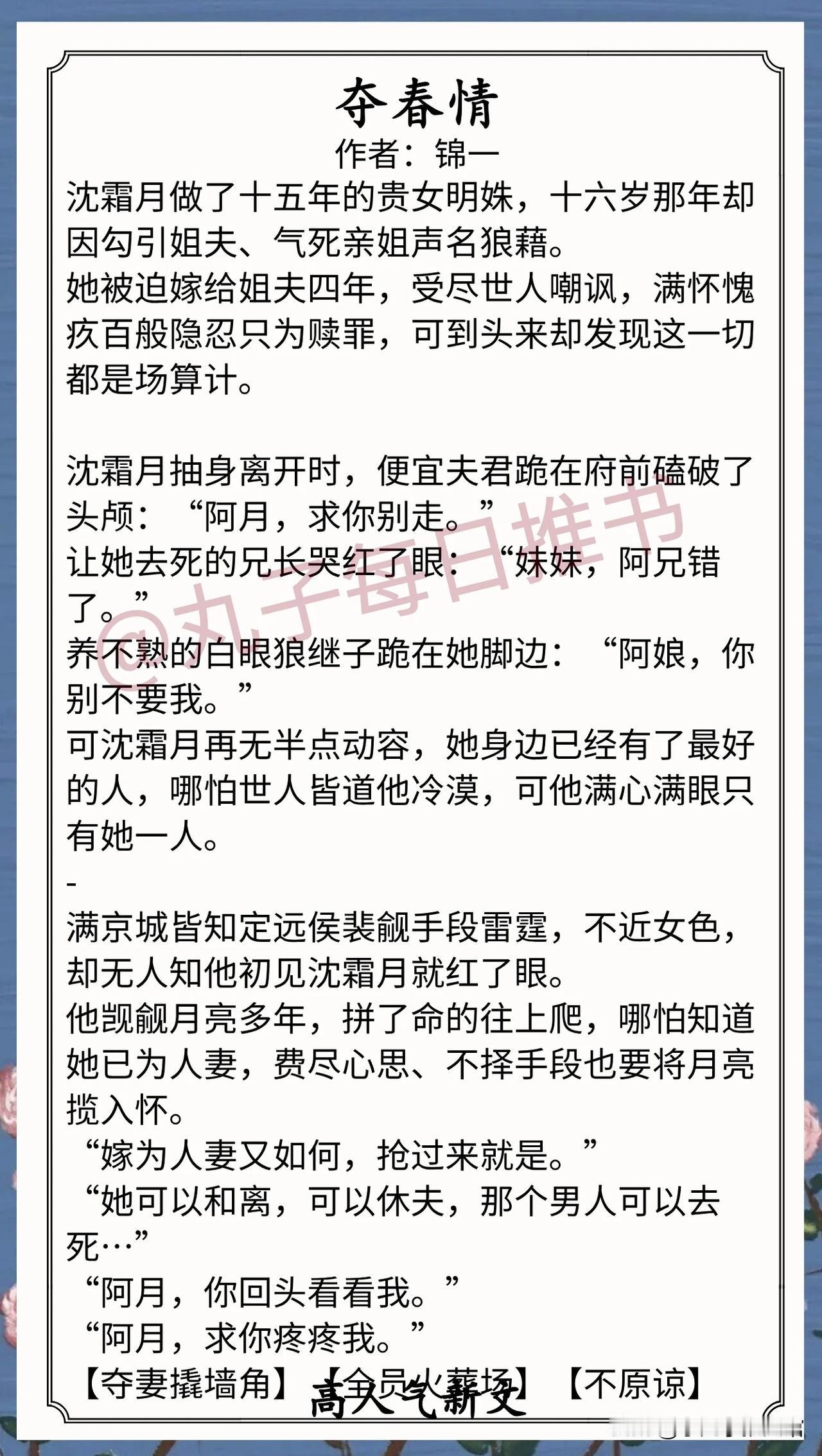 5. 《夺春情》作者:锦一(贵女vs侯爷,男暗恋女,撬墙角,渣男火葬场)