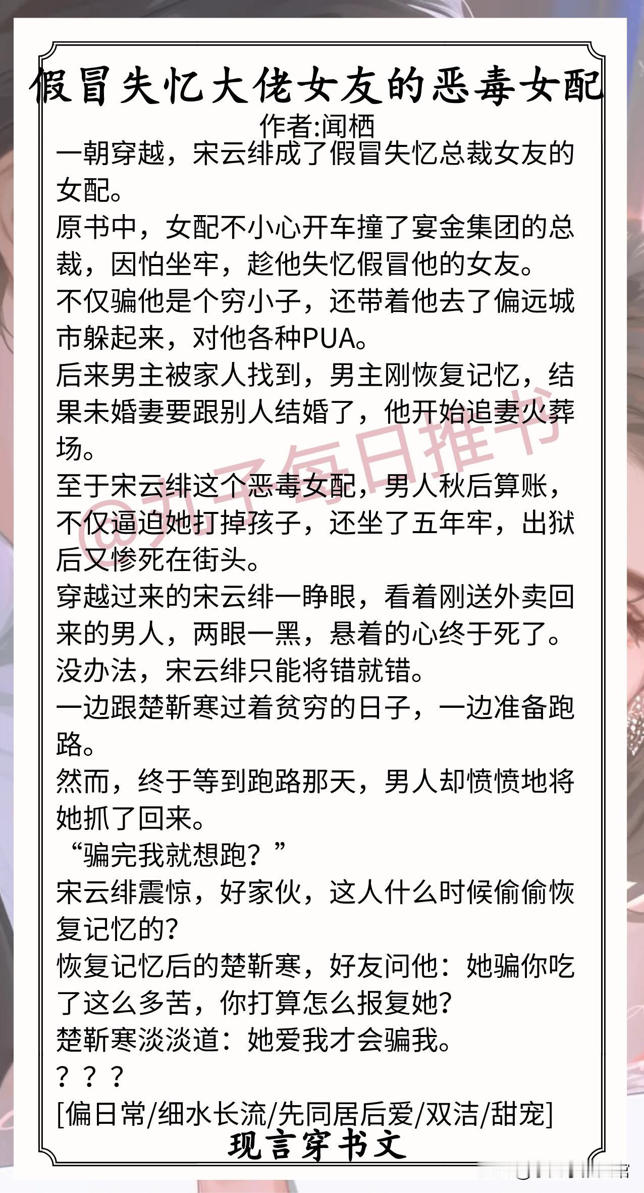 7.《穿成假冒失忆大佬女友的恶毒女配》作者:闻栖(心机拜金美人vs恋爱脑总裁,穿书,失忆梗,细水长流,日常甜宠向)