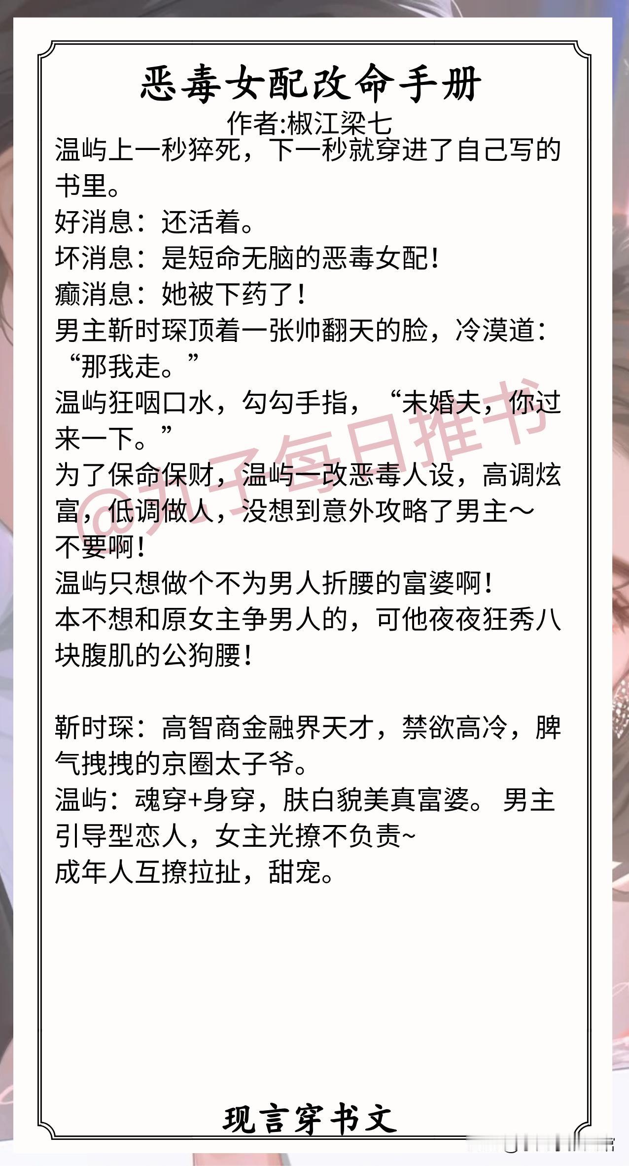 5.《恶毒女配改命手册》作者:椒江梁七(肤白貌美真富婆vs高冷京圈太子爷,穿书,寄宿文学,虐渣打脸)