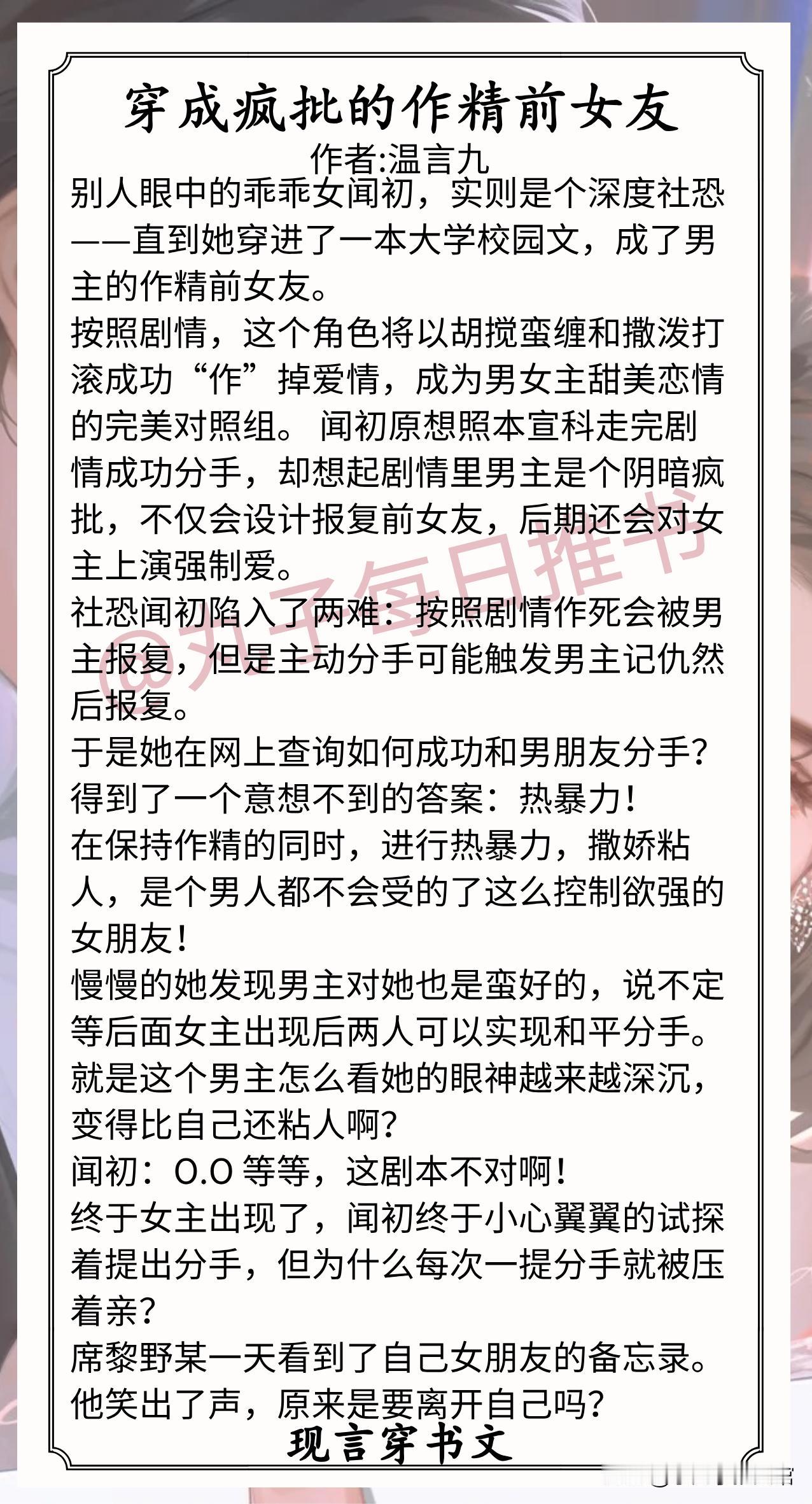 6.《穿成疯批的作精前女友》作者:温言久(社恐软妹vs高冷大佬,穿书,对照组躺赢,大学校园,超甜宠文)