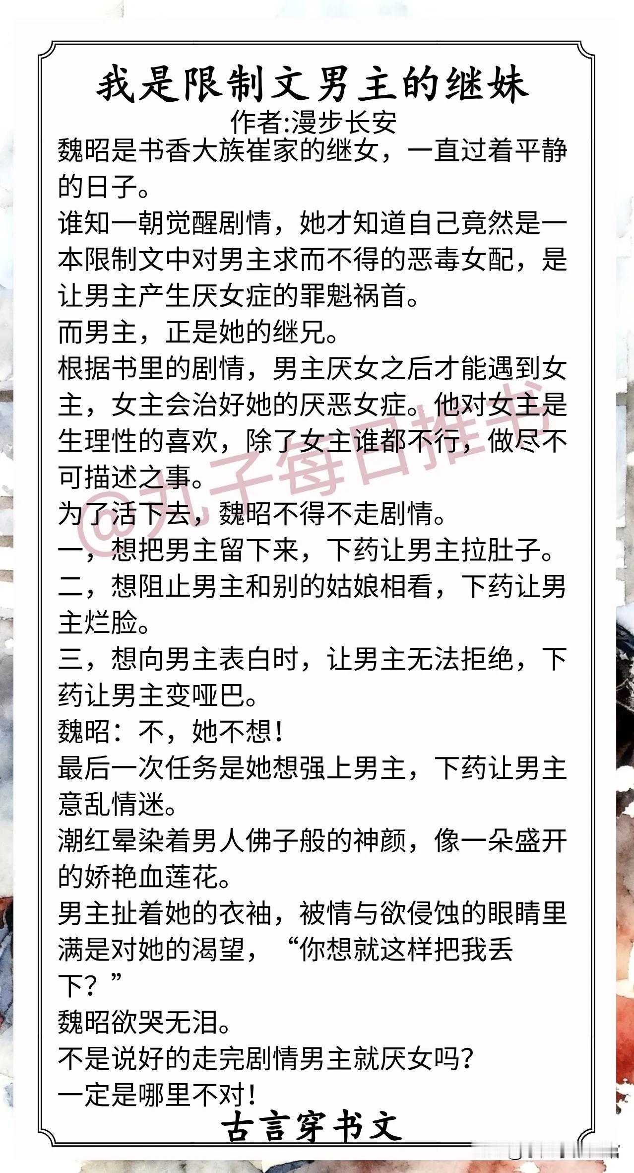 7.《我是限制文男主的继妹》作者:漫步长安(被迫走剧情继妹vs高岭之花继兄,穿书,女配苟命,古言甜宠文)