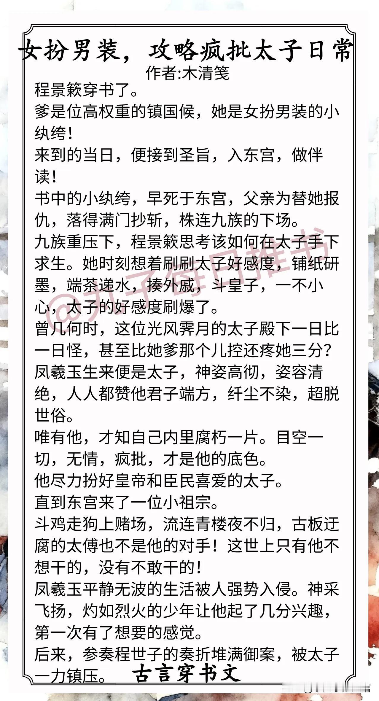 9.《女扮男装,攻略疯批太子日常》作者:木清笺(纨绔vs太子,穿书,抱大腿,女扮男装)小说 推文