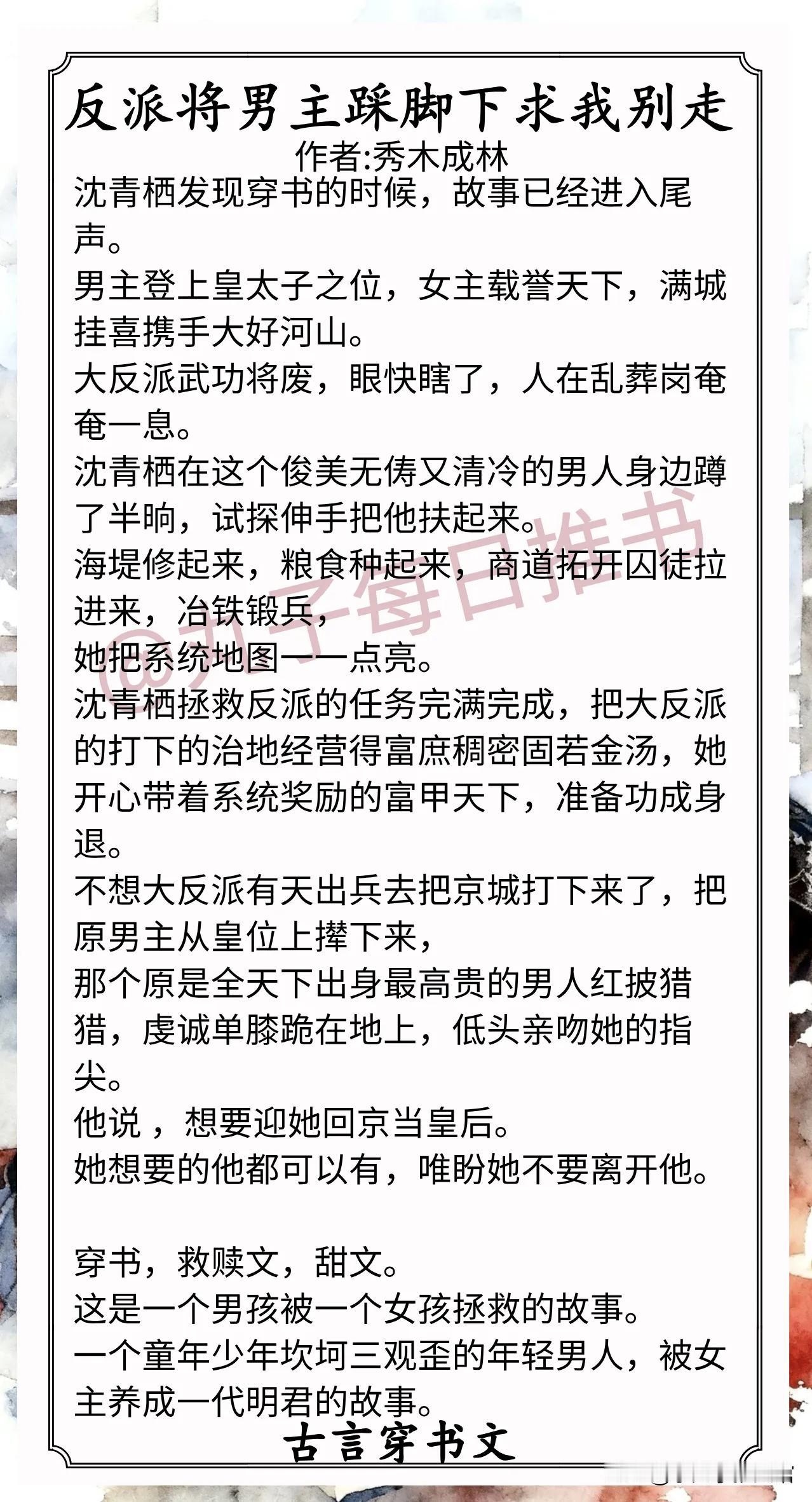 5.《反派将男主踩脚下求我别走》作者:秀木成林(清醒全能女vs未来明君,穿书,救赎,打天下,大格局权谋文)