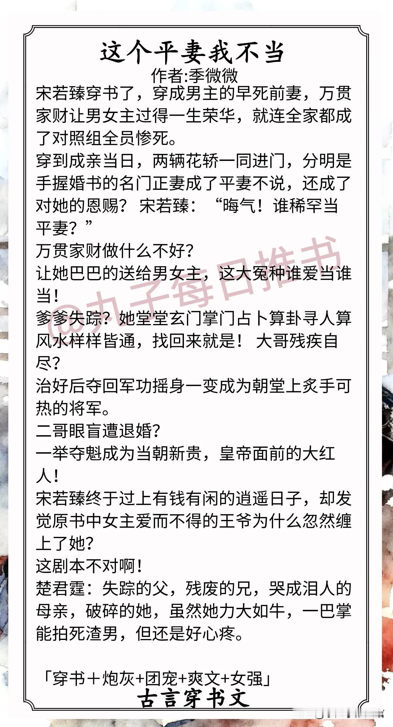 3.《这个平妻我不当》作者:季微微(彪悍女主vs宠妻王爷,穿书,女配逆袭,女强爽文)