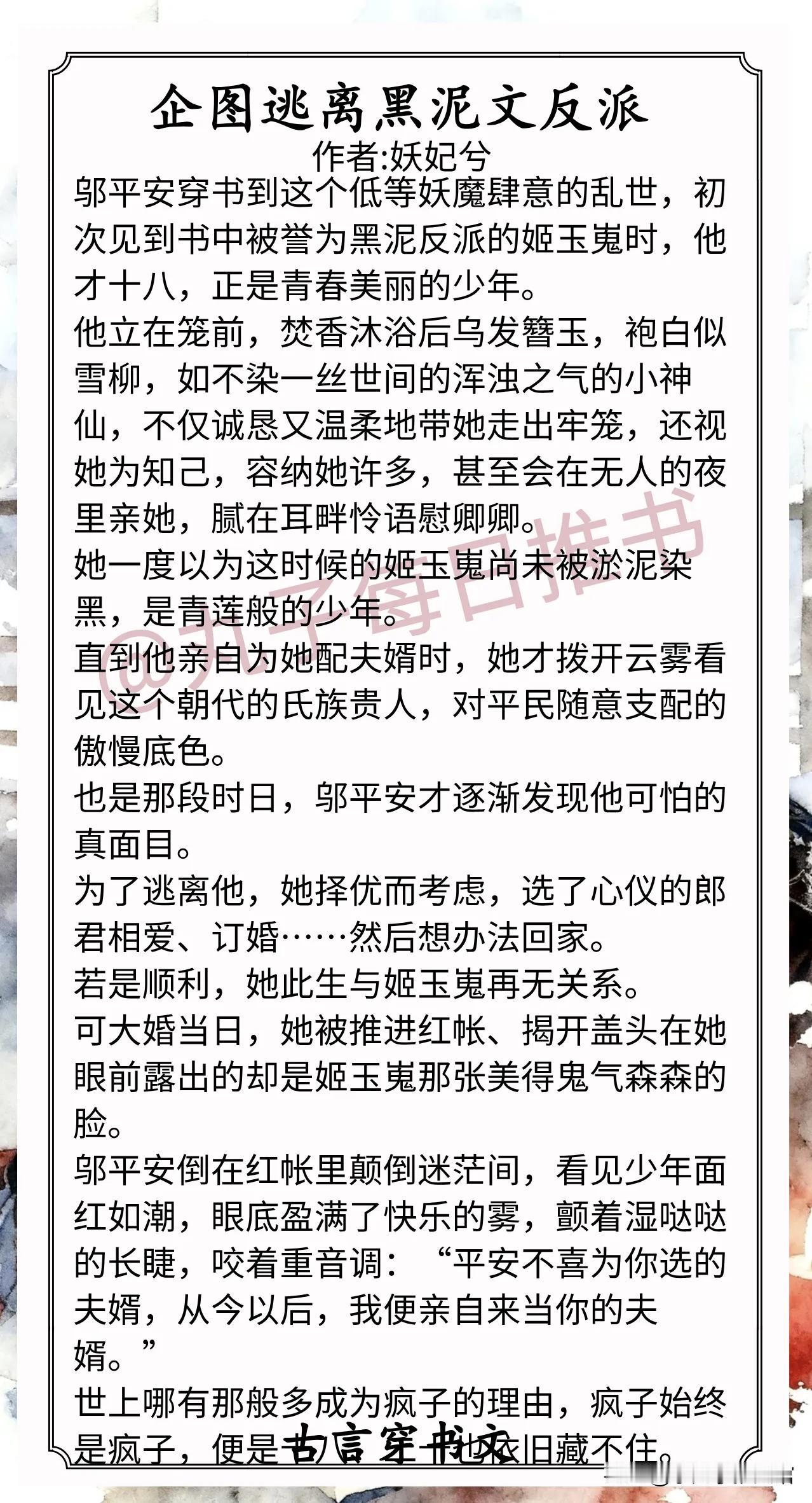 4.《企图逃离黑泥文反派》作者:妖妃兮(穿书普通底层女vs美貌阴暗疯批,真香,强取豪夺,魏晋背景)