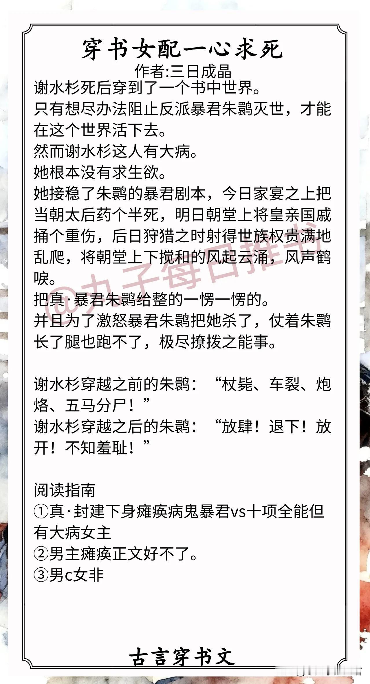 6.《穿书女配一心求死》作者:三日成晶(十项全能但有大病女主vs真封建下身瘫痪病鬼暴君,穿书,作死日常,双向救赎小甜饼)