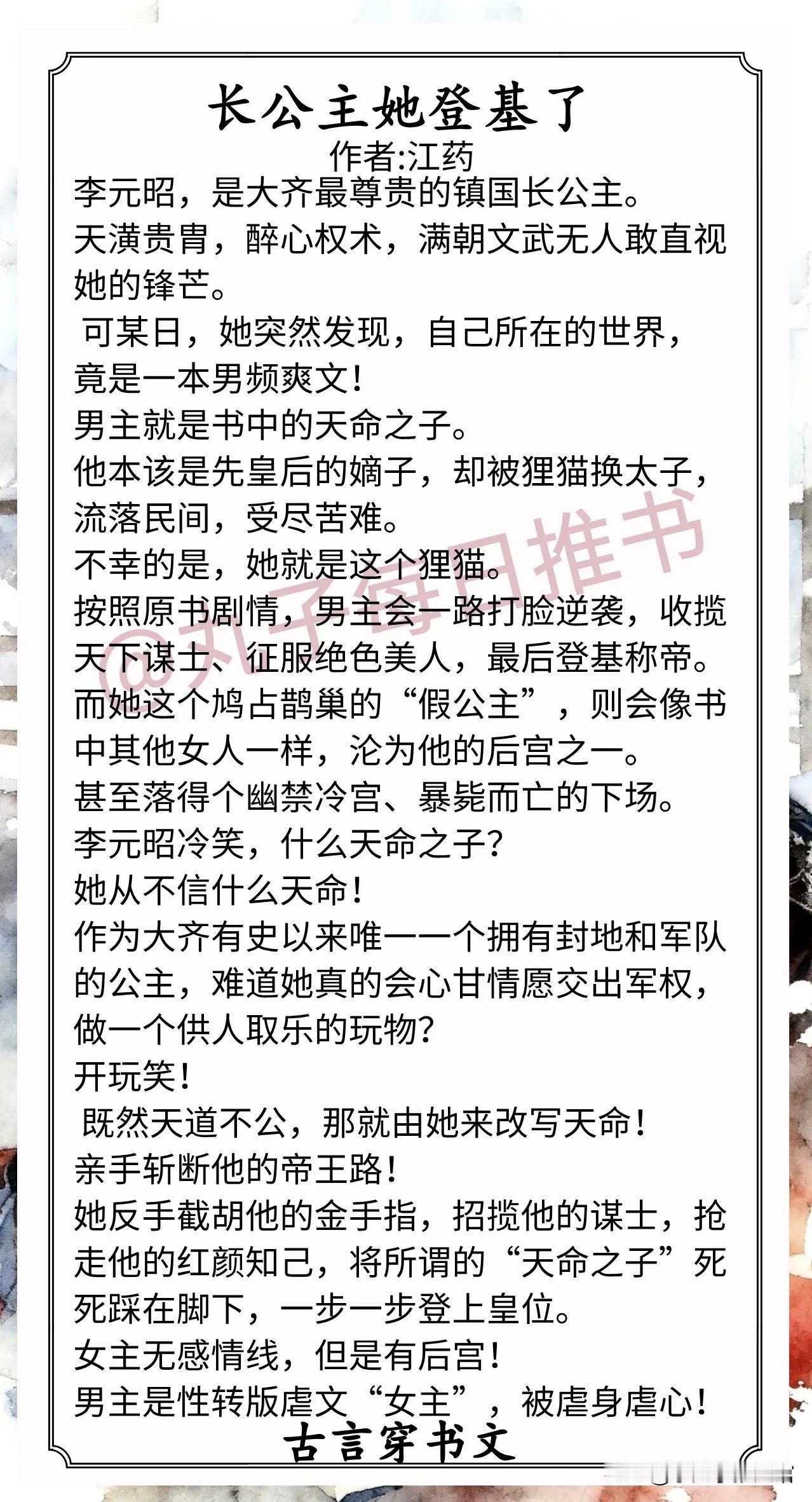 2.《长公主她登基了》作者:江药(人狠话不多疯批公主,穿书,女配,大搞事业,女帝之路)