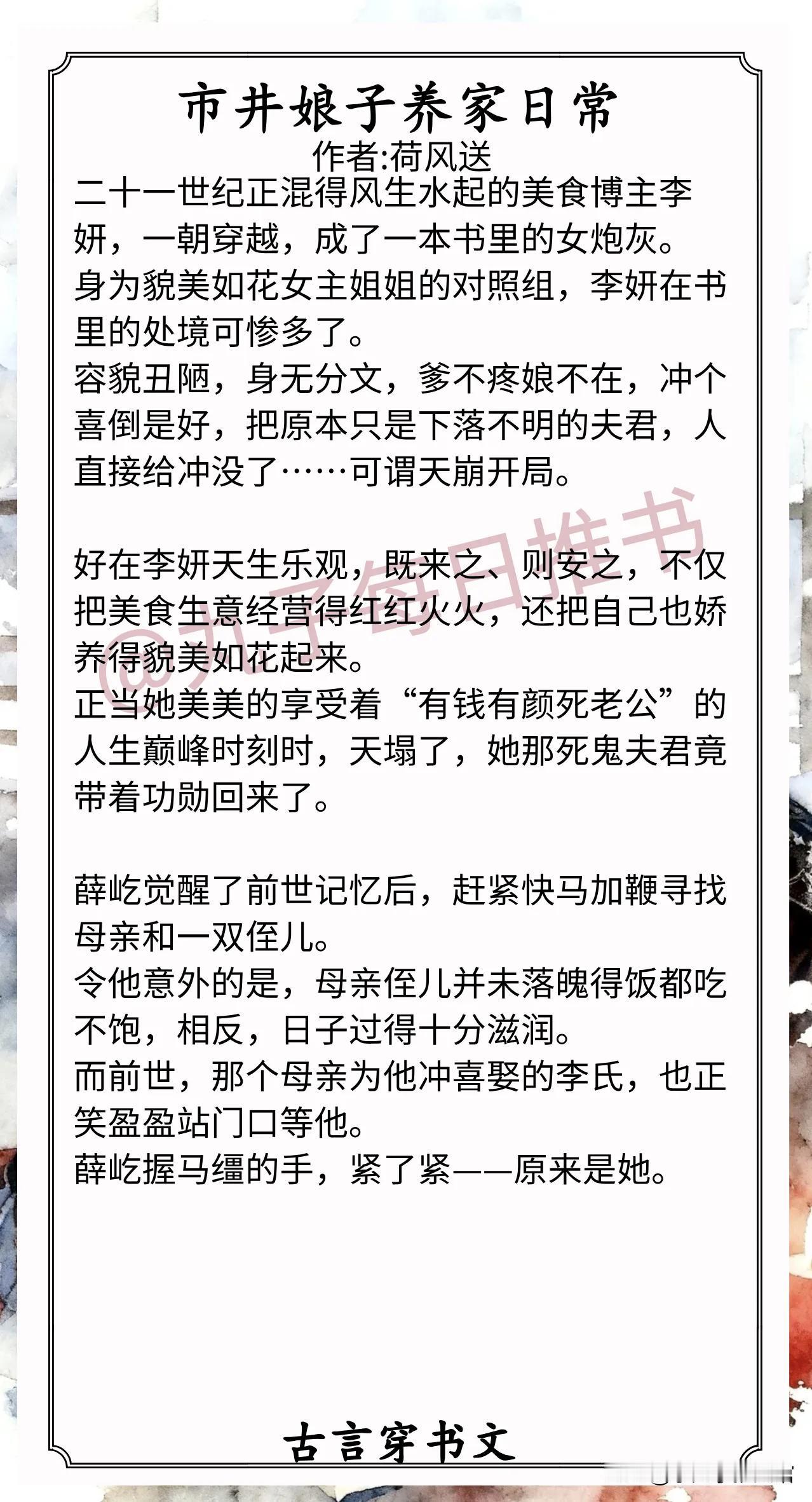 8.《市井娘子养家日常》作者:荷风送(穿书博主vs重生糙汉,美食致富,市井生活)