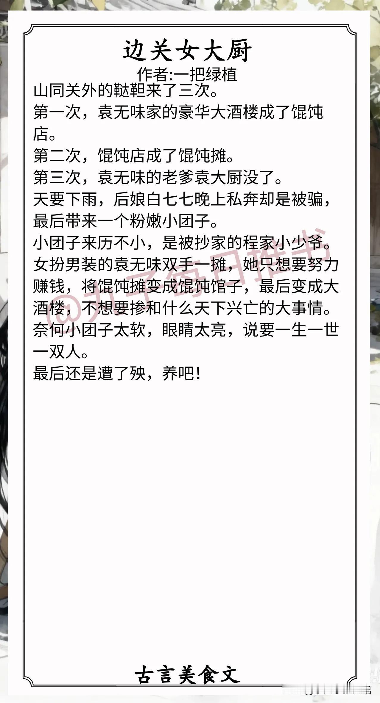 3.《边关女大厨》作者:一把绿植(遗孤厨娘vs养成系年下,美食,权谋,边关日常文)