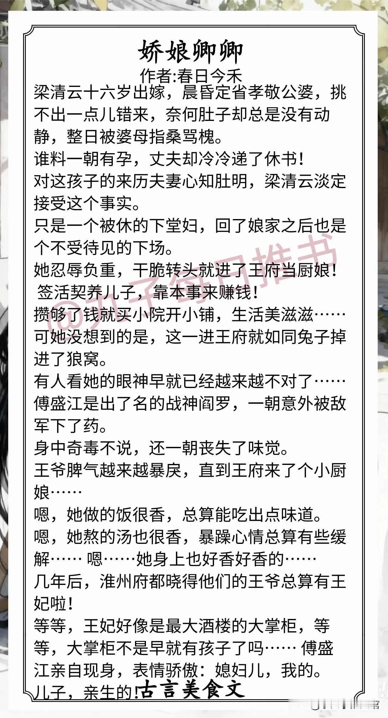 2.《娇娘卿卿》作者:春日今禾(小厨娘vs战神王爷,美食,二婚养崽,甜宠日常)