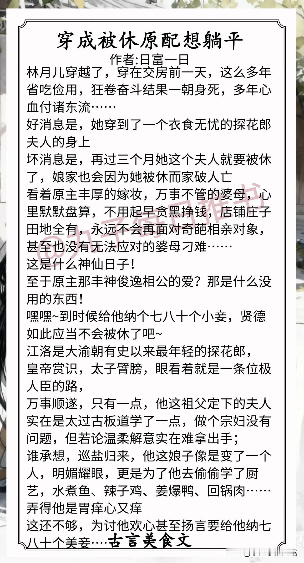 4.《穿成被休原配想躺平》作者:日富一日(咸鱼乐观美人vs宠妻温柔权臣,穿越,美食日常,先婚后爱,温馨鸡飞狗跳生活)