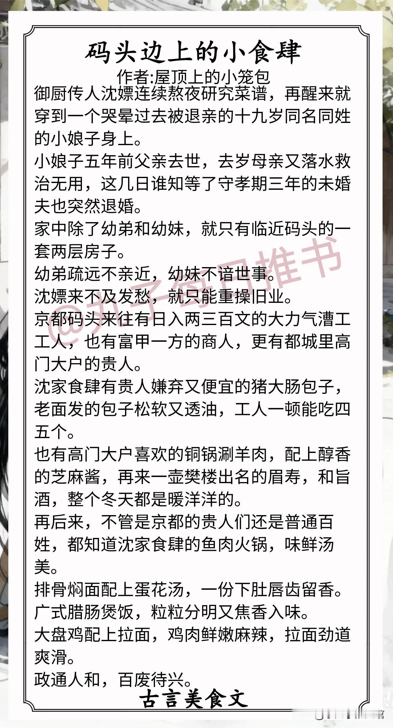 9.《码头边上的小食肆》作者:屋顶上的小笼包(全能厨娘,穿越,美食日常,发家致富,汴京故事)小说 推文