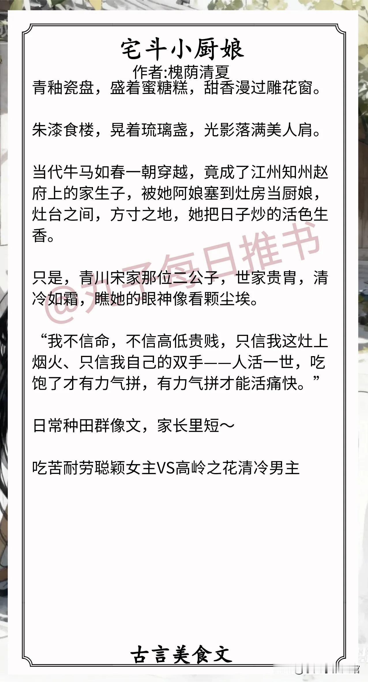 8.《宅斗小厨娘》作者:槐荫清夏(坚韧聪慧小丫鬟清冷温柔世家公子,穿越,家长里短,美食群像文)