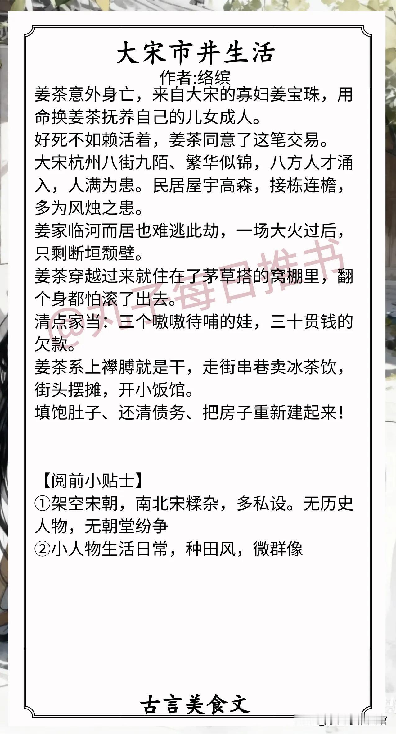6.《大宋市井生活》作者:络缤(能干小寡妇,穿越,美食经营,发家致富,宋朝小人物生活日常,无cp)