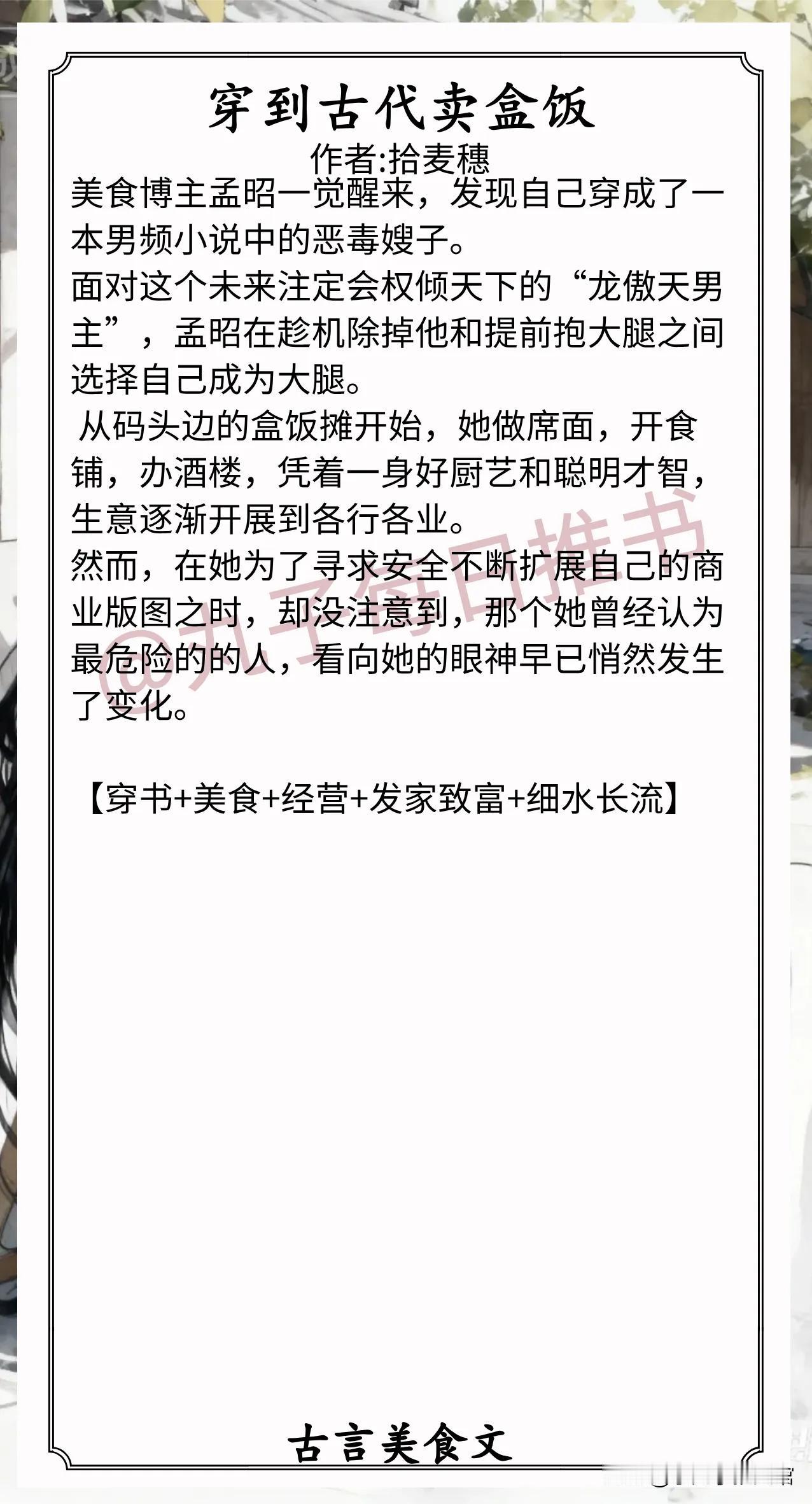 7.《穿到古代卖盒饭》作者:拾麦穗(美食博主vs阴湿状元,穿书,美食经营,发家致富,温馨种田文)