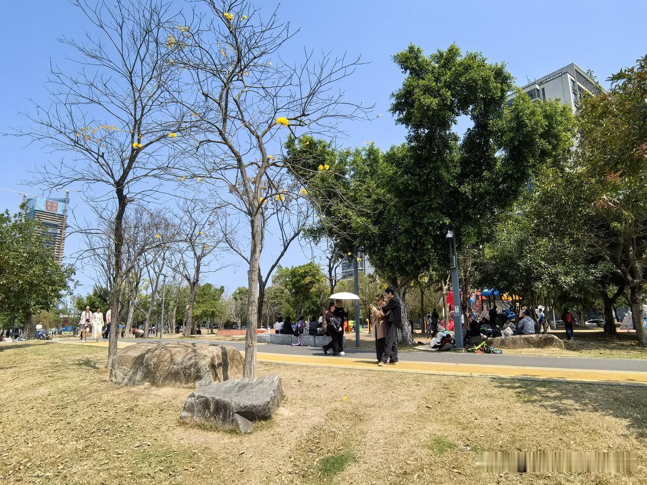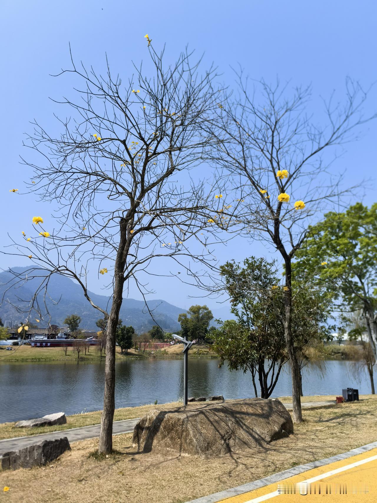 这一方山水胜地,美得令人心醉!天晴时,旗山湖公园的天空湛蓝如洗,远处的旗山隐隐约约,湖水清澈透明,黄花风铃木尽情绽放,点亮了湖边景致。露营的天幕中,传来游人欢快的笑声。周末时分,逃离城市的钢筋水泥丛林,来此呼吸醇厚的新鲜空气,放眼远眺,舒缓紧绷的心情,岂不美哉!