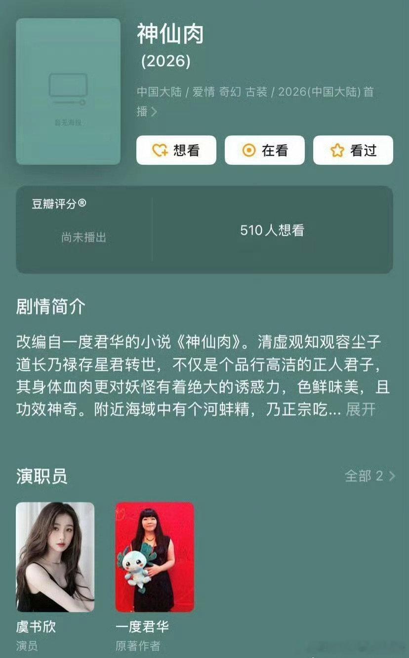 《神仙肉》改名《念相思》,目前开通官博 豆瓣演员表只有虞书欣,未知男主人选