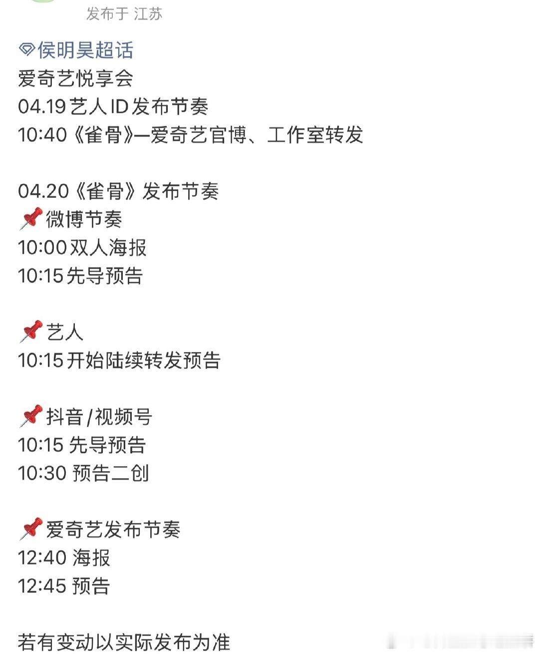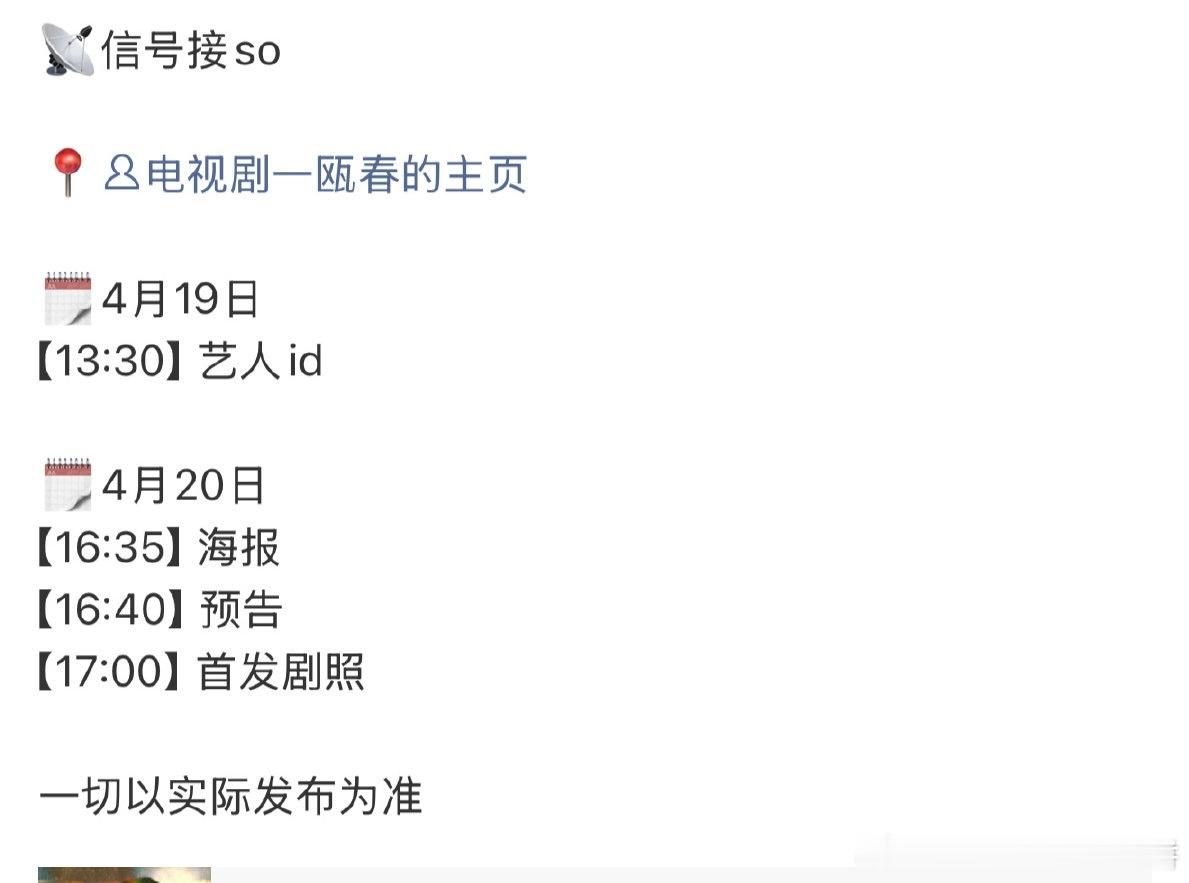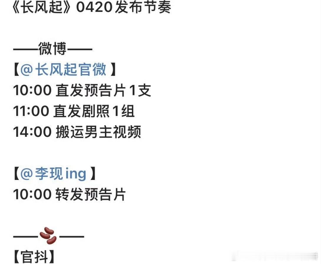 20号爱奇艺悦享会将会发布物料的剧集:李现、李一桐《长风起》罗云熙《魅影神捕》许凯、周也《一瓯春》李现、张婧仪《雾里青》侯明昊、艾米《雀骨》侯明昊《碧血蝉》