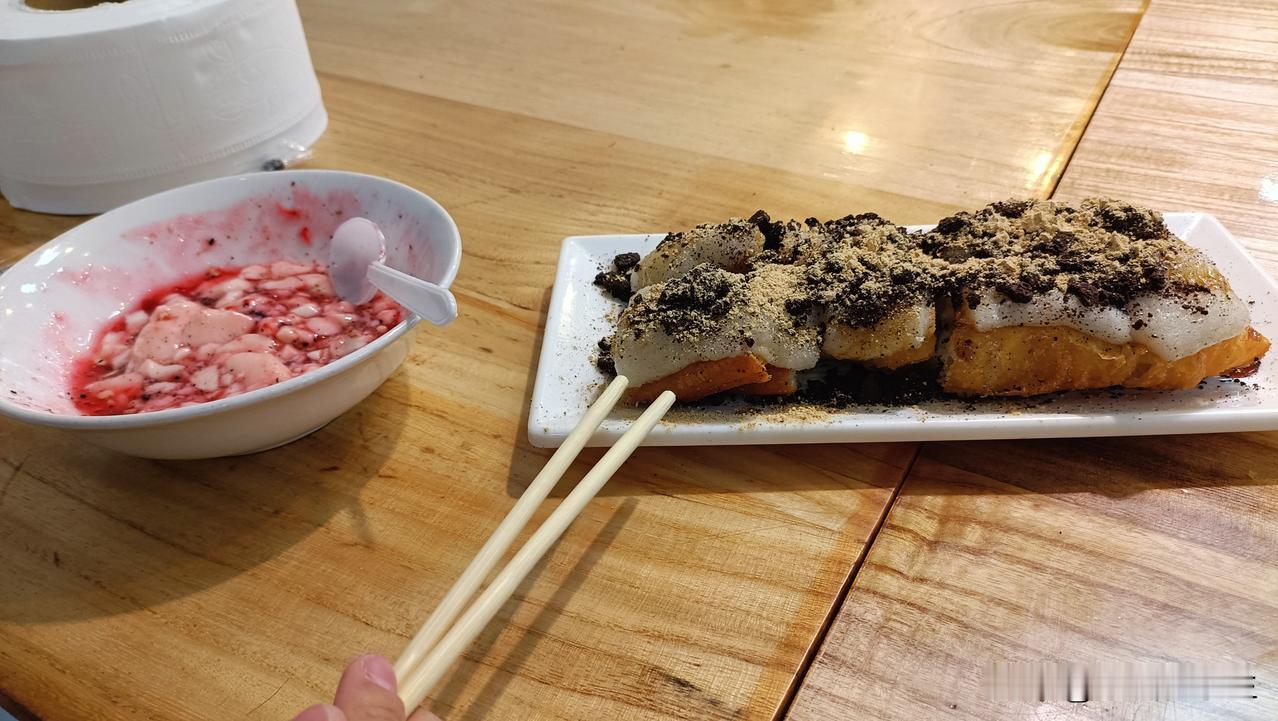 油条个头大,可以再加上糯米糕,撒上各种口味的食材,做成红糖年糕,奥利奥年糕等等……