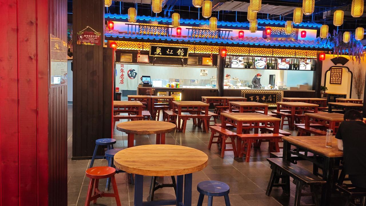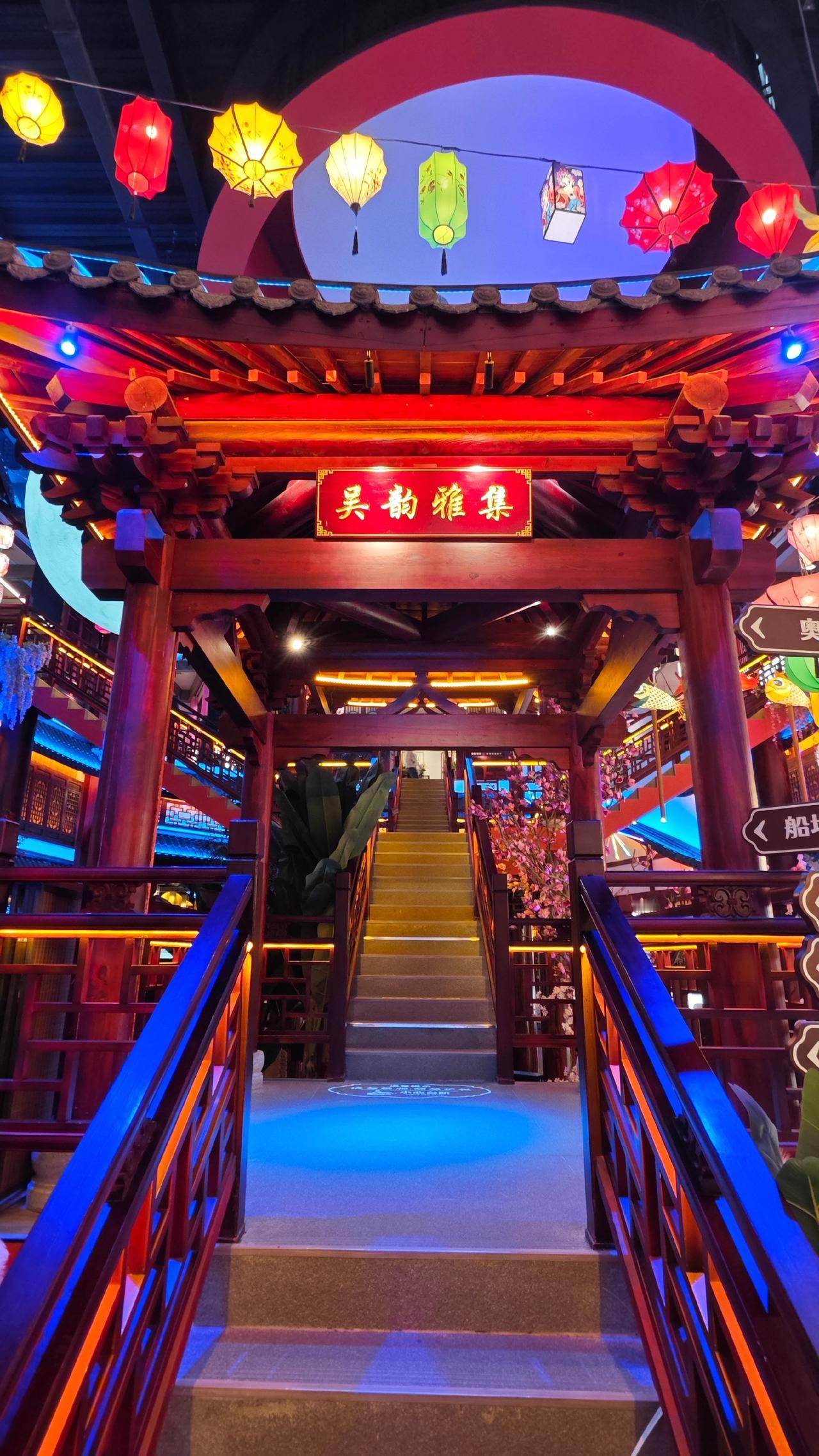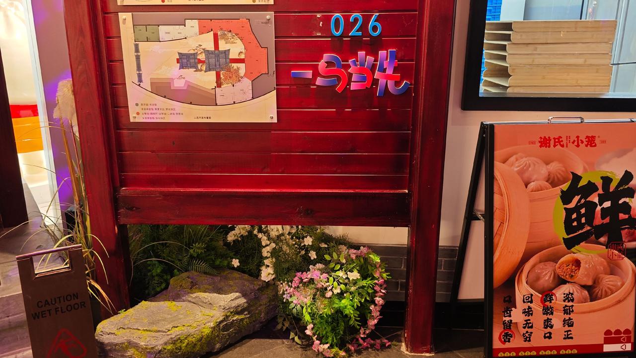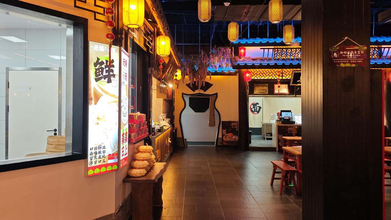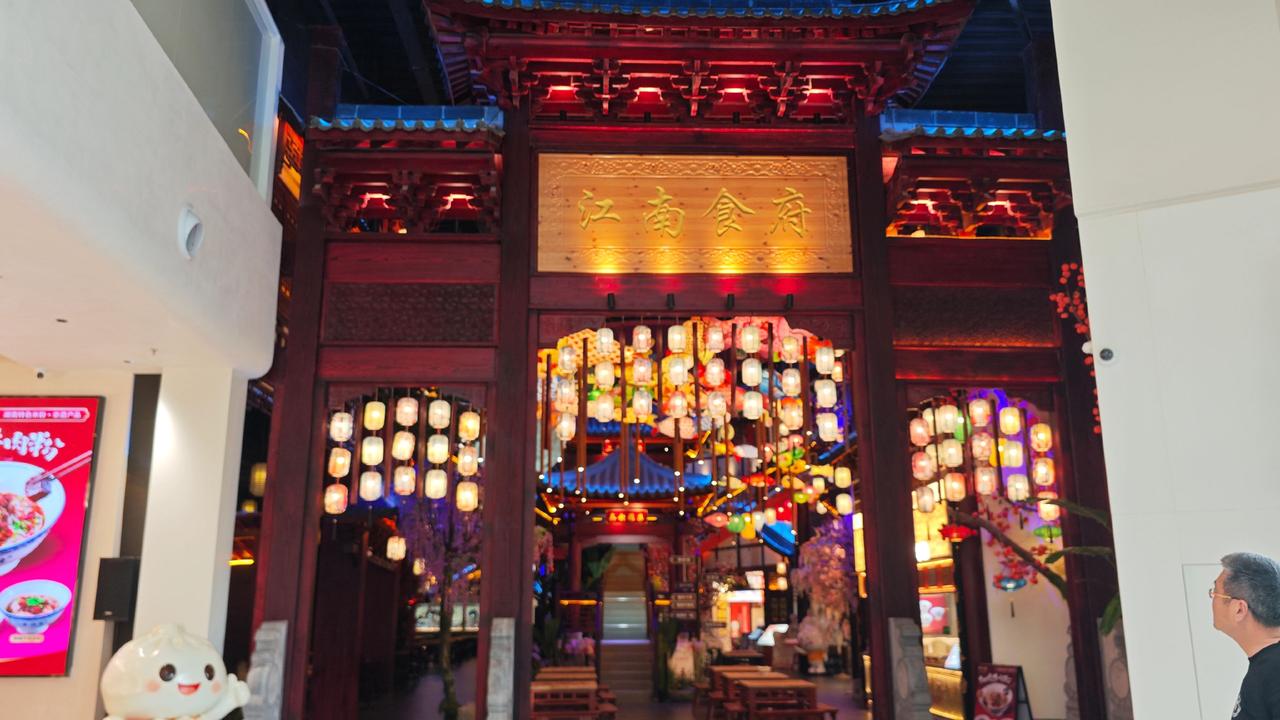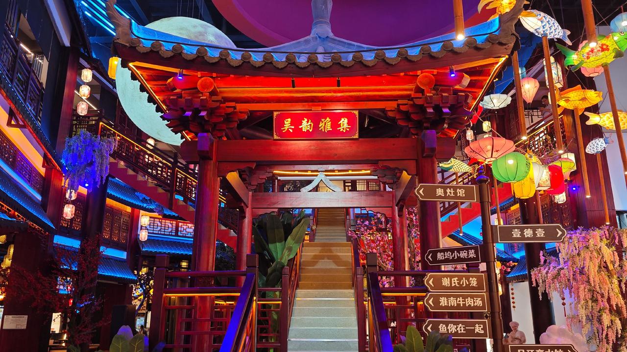 刚踏入北区大楼,右手边那座江南特色的牌坊就先撞个满怀,飞檐翘角、灯笼高挂,古朴雅致的质感瞬间拉满氛围感 。穿过牌坊往里走,复刻唐宋建筑风貌的美食街徐徐展开,亭台廊榭错落有致,叠山理水的设计藏着中式浪漫的细节,连空气里都飘着食物的香气与古意的温柔。这里的美食集合真的太懂旅人的心,既有奥灶馆、谢氏小笼这样的非遗老字号,又有无锡脚踏糕、三凤酱排骨等本地特色,还有肯德基、霸王茶姬这些连锁品牌,不管是想嗦碗热乎面条,还是啃个汉堡快速补给,都能满足。