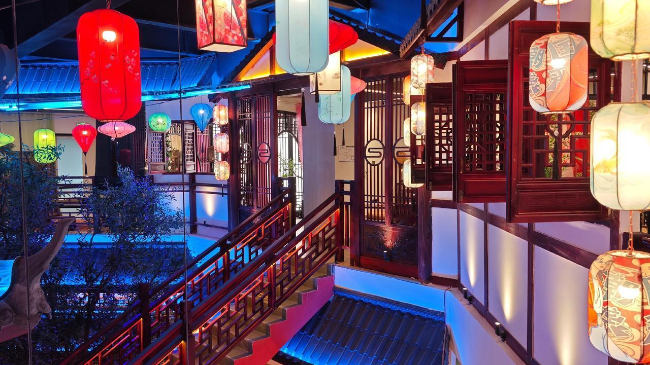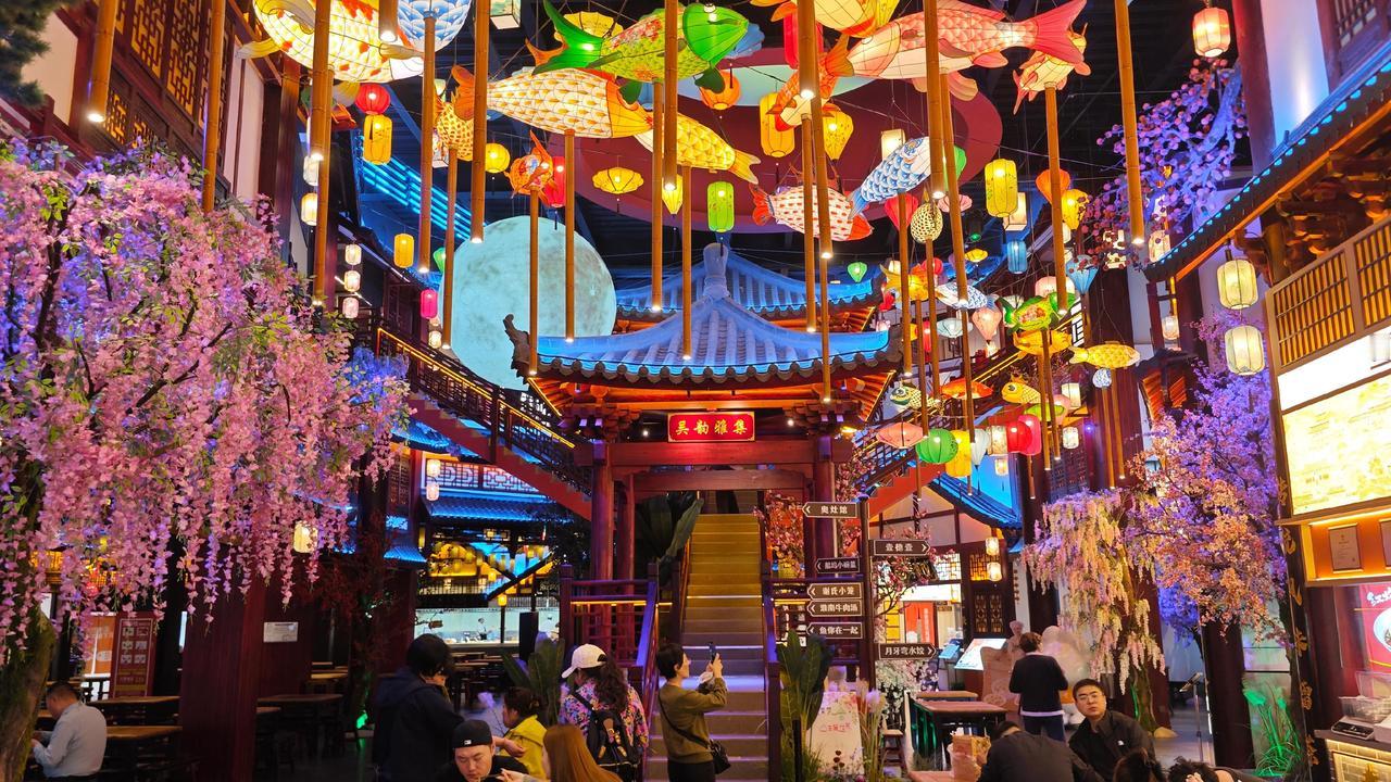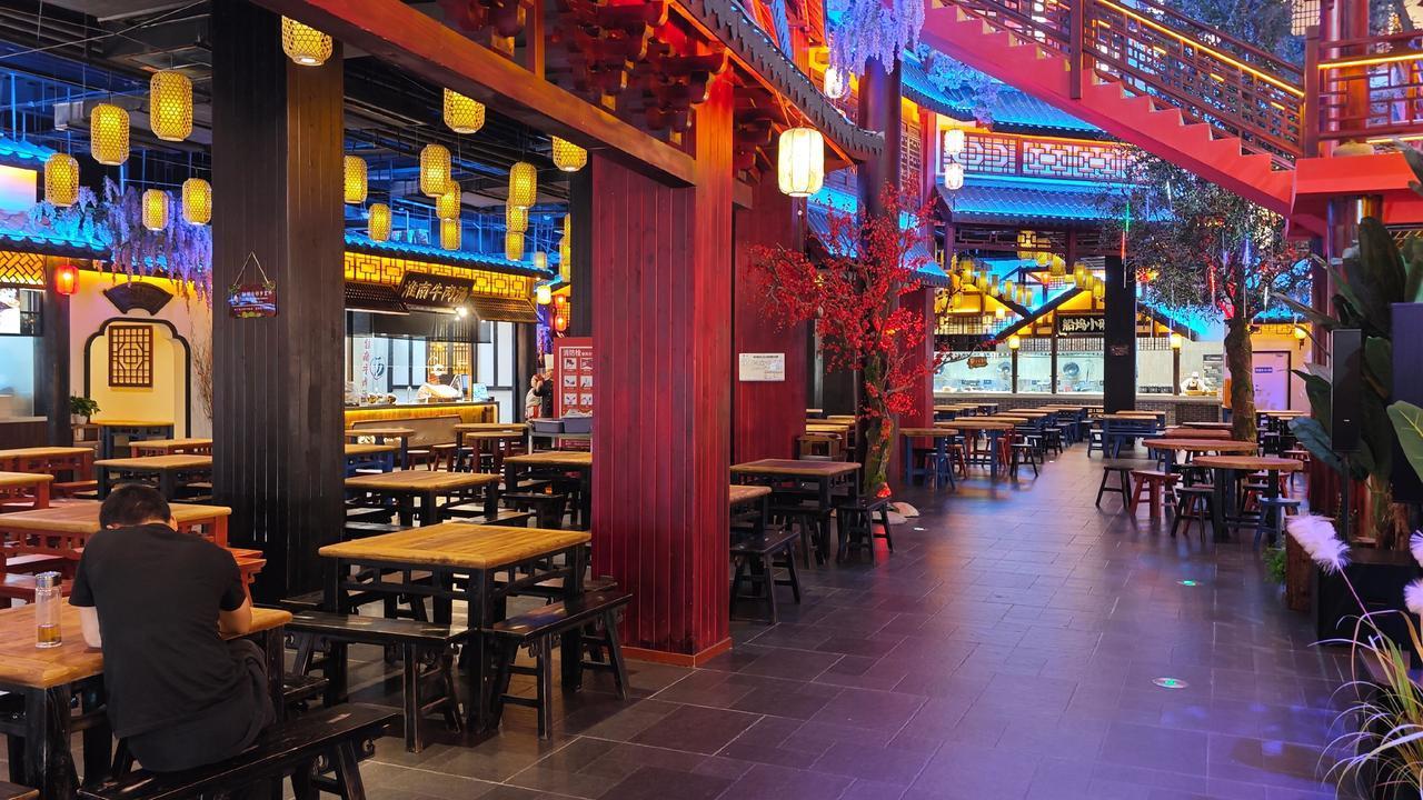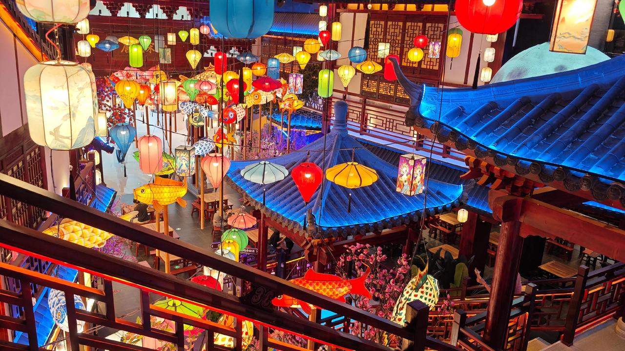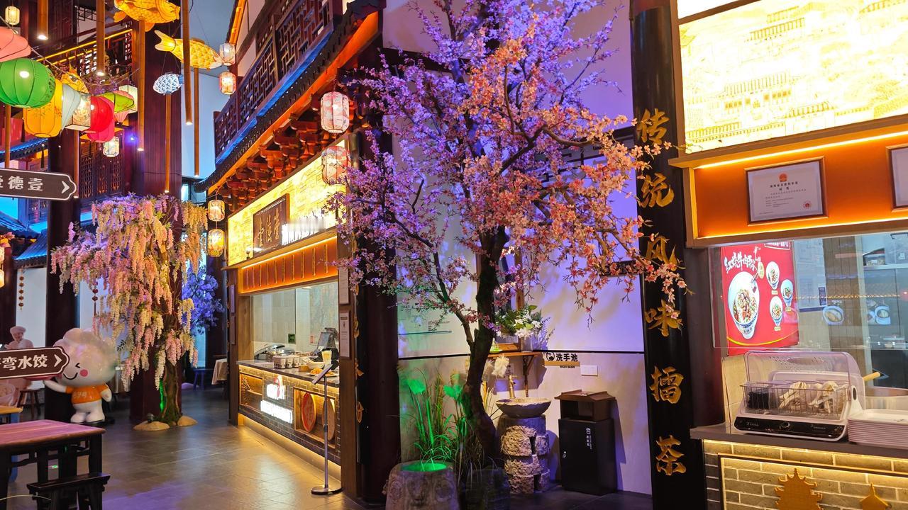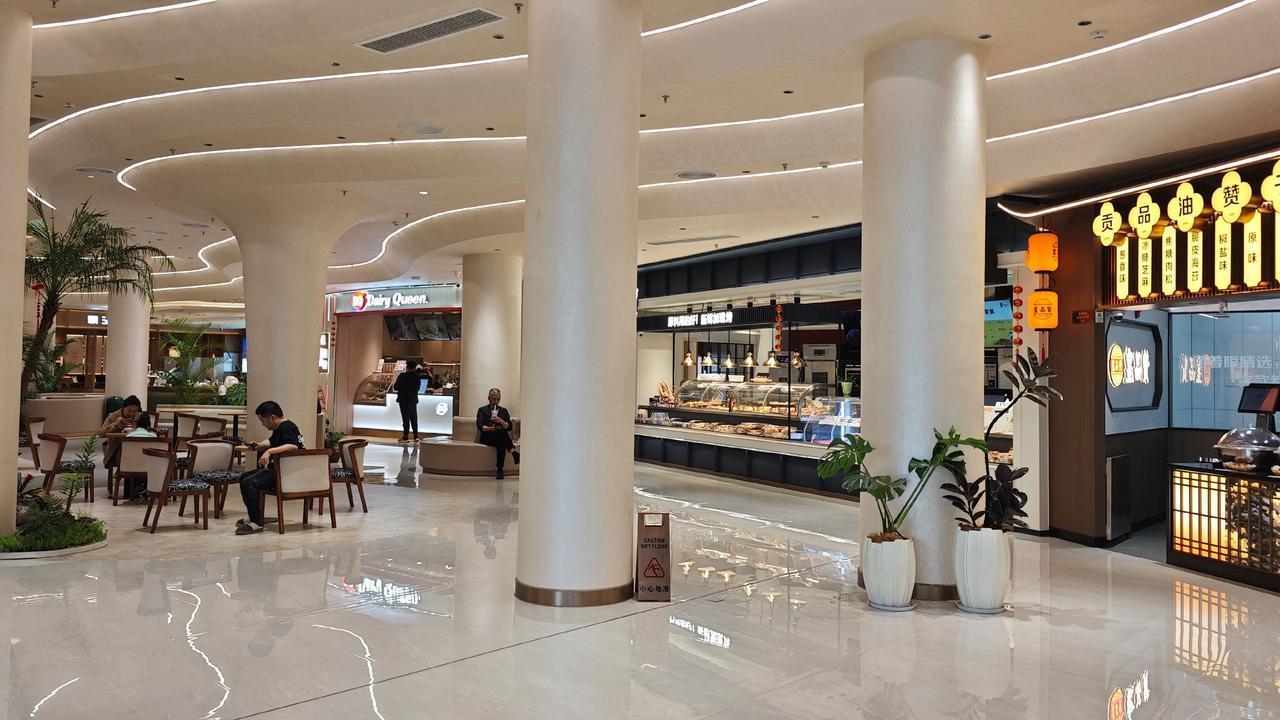 刚踏入北区大楼,右手边那座江南特色的牌坊就先撞个满怀,飞檐翘角、灯笼高挂,古朴雅致的质感瞬间拉满氛围感 。穿过牌坊往里走,复刻唐宋建筑风貌的美食街徐徐展开,亭台廊榭错落有致,叠山理水的设计藏着中式浪漫的细节,连空气里都飘着食物的香气与古意的温柔。这里的美食集合真的太懂旅人的心,既有奥灶馆、谢氏小笼这样的非遗老字号,又有无锡脚踏糕、三凤酱排骨等本地特色,还有肯德基、霸王茶姬这些连锁品牌,不管是想嗦碗热乎面条,还是啃个汉堡快速补给,都能满足。