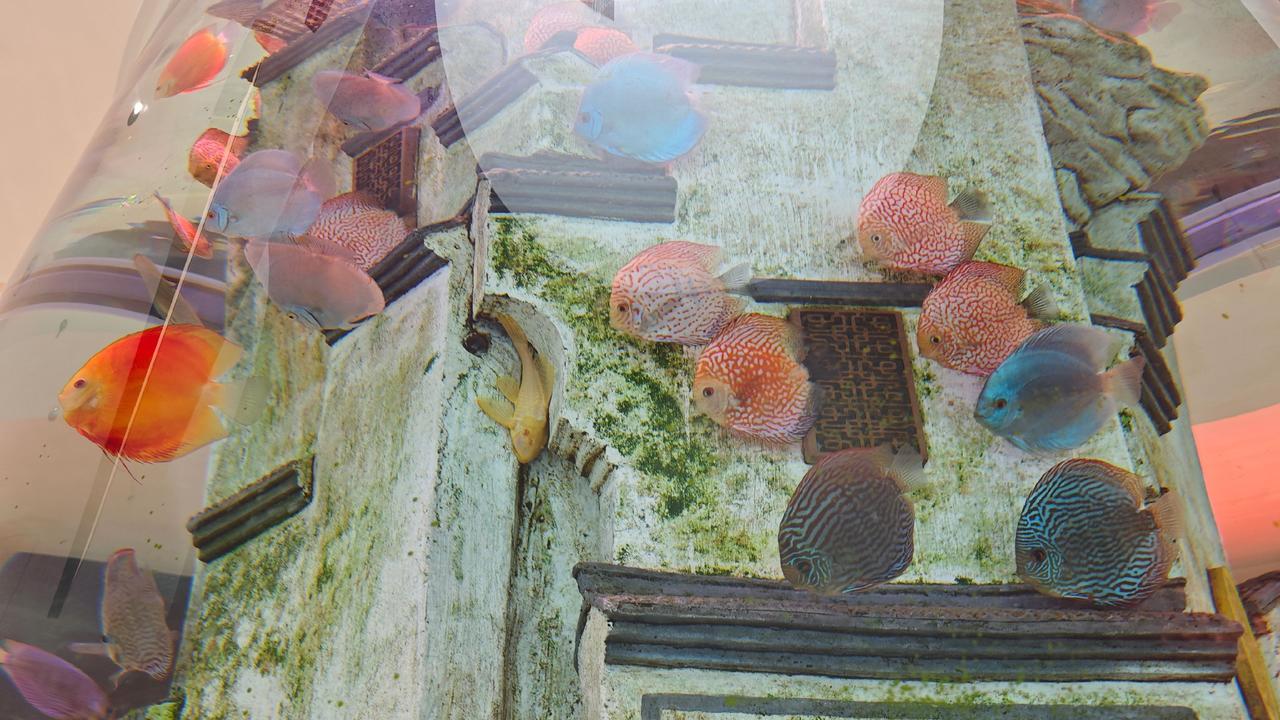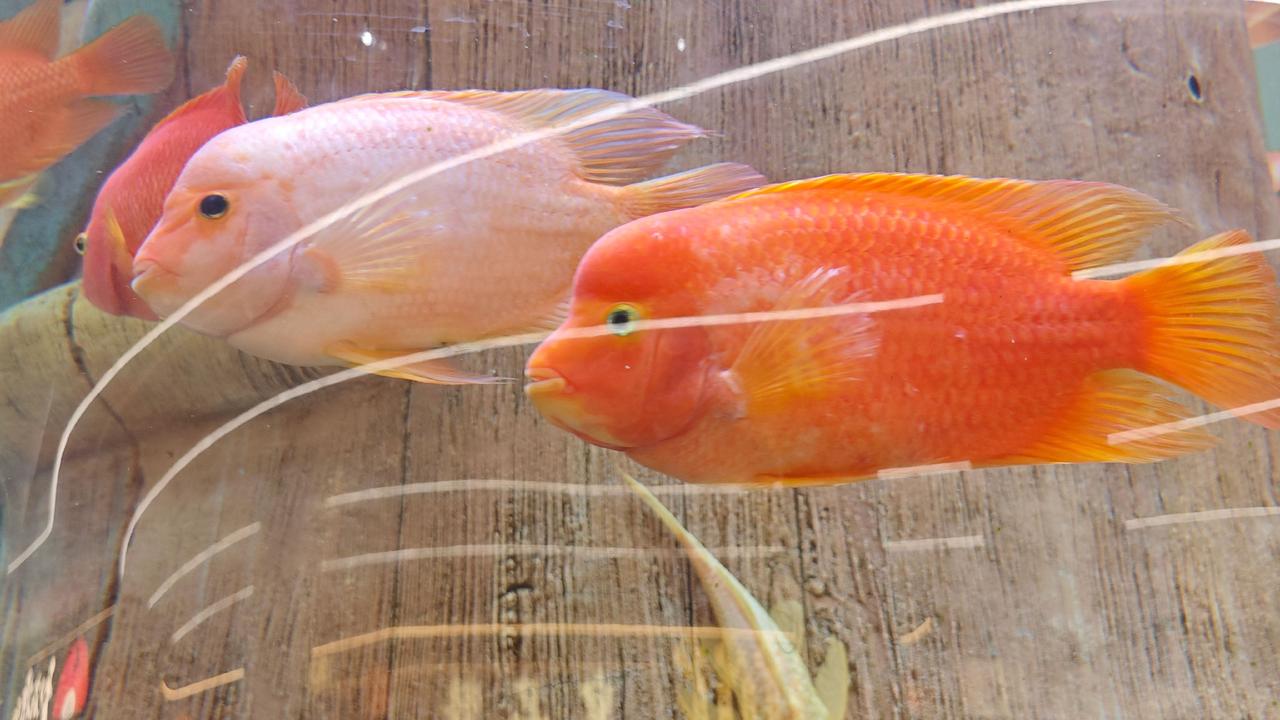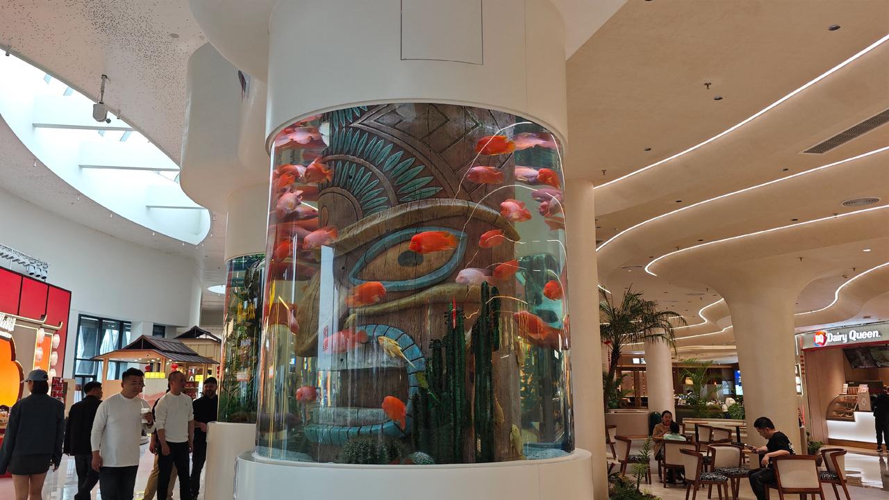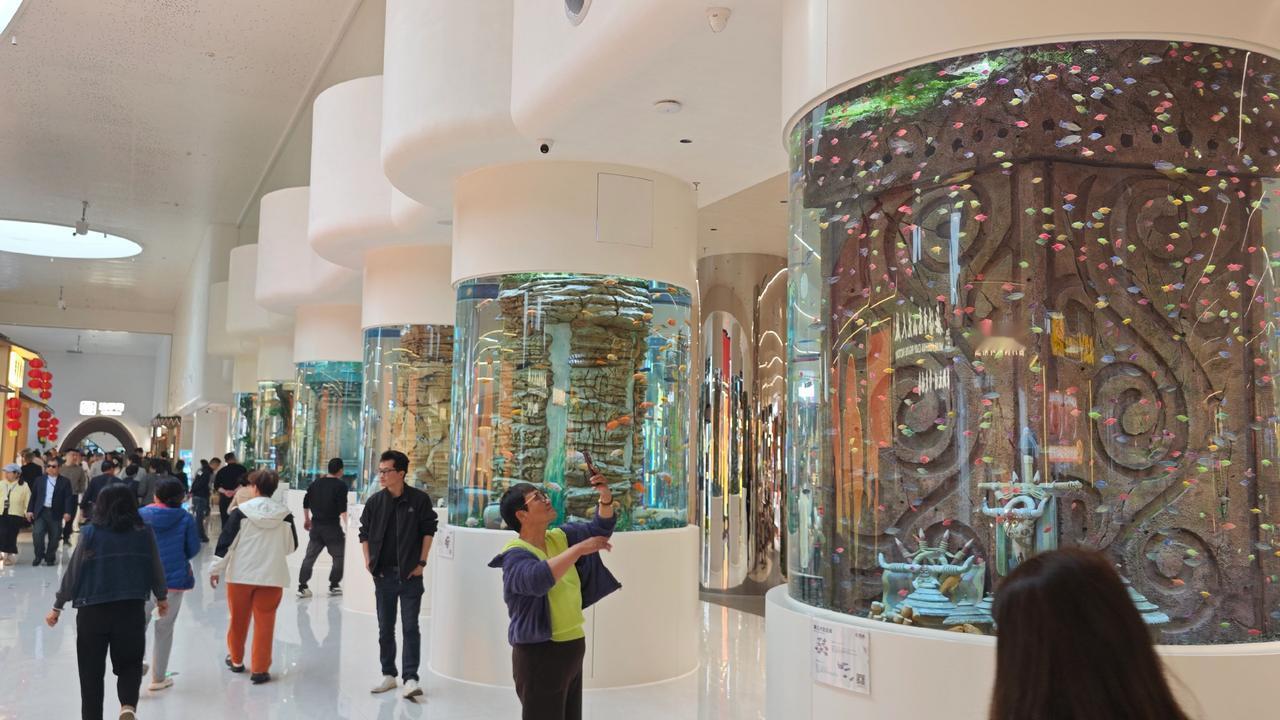 但真正让人挪不动脚的,还是那排一字排开的大型圆柱鱼缸,这可是全国服务区里首个大型淡水鱼生态区,十个近3米高的亚克力巨缸,把“一缸一世界”的意境做到了极致。红财神鱼、神仙鱼、巨骨舌鱼等珍稀淡水鱼在水草间悠然游弋,光影在水面流转,群鱼穿梭的灵动模样,恍惚间就像闯入了一片静谧的水下森林。我就蹲在缸边看了好久,看小鱼成群掠过,看水草轻轻摇曳,连赶路的疲惫都被这股鲜活的生机悄悄治愈 。