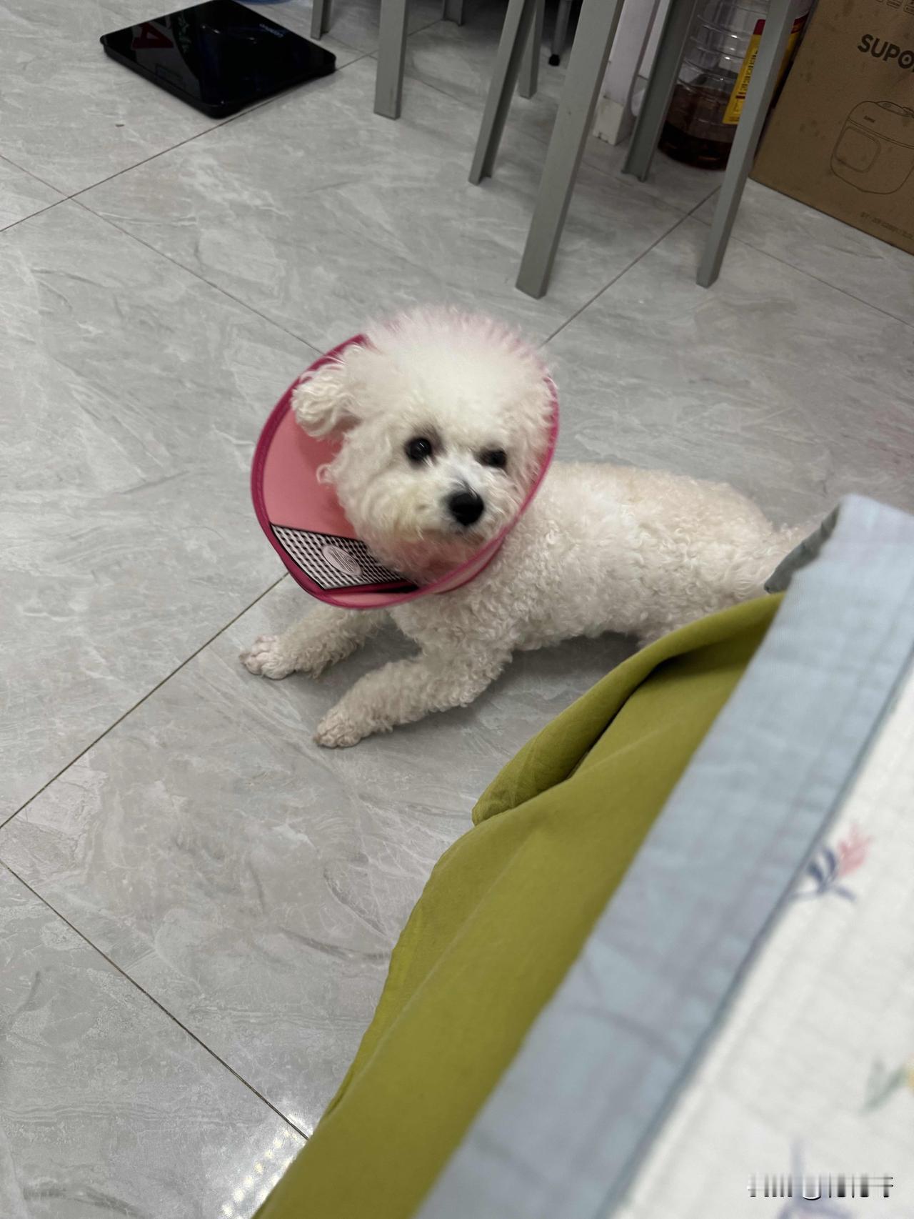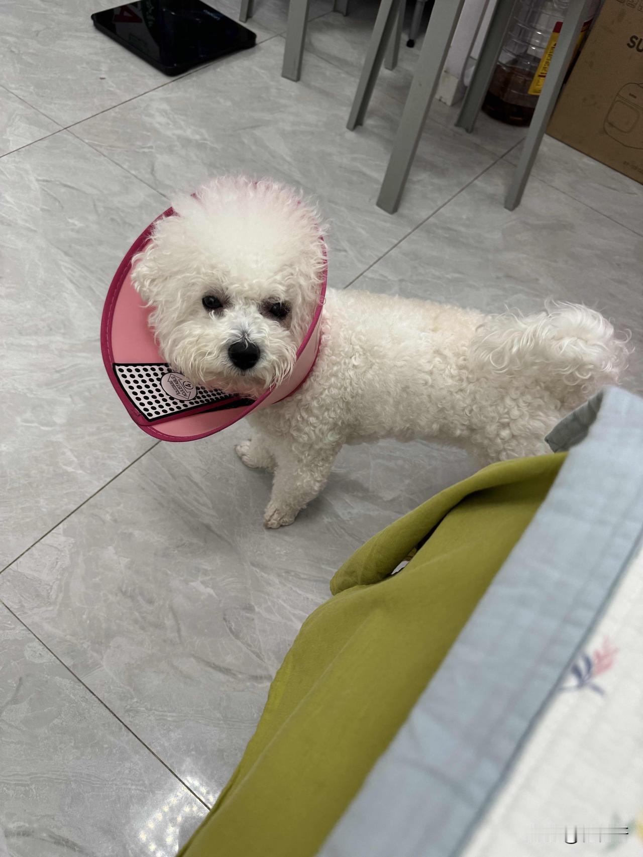 我家小比熊戴伊丽莎白圈都好几天啦。它脖子下之前起了个小包,现在结痂快好了,为了防止它抓挠才一直让它戴着。