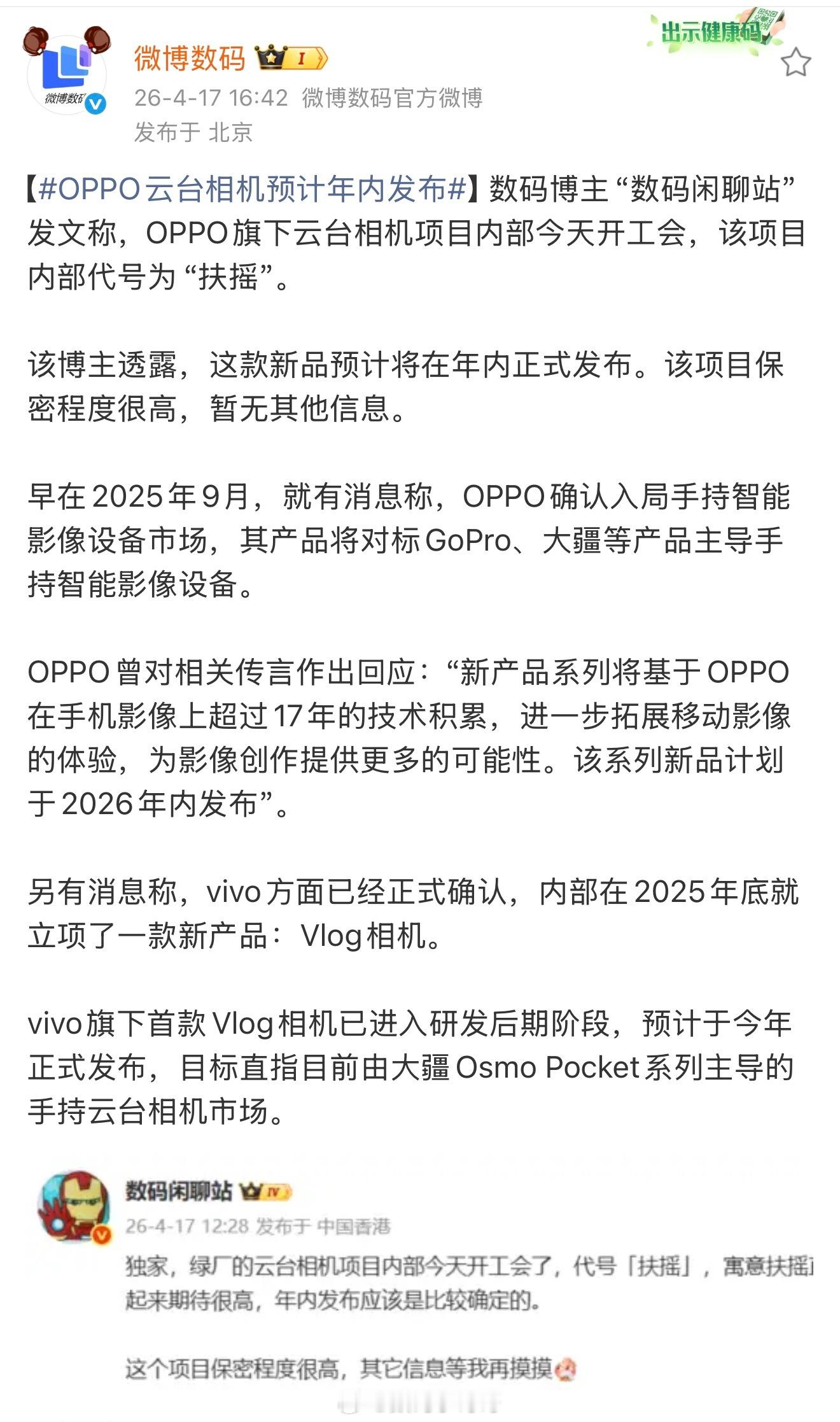 OPPO云台相机预计年内发布挺好的,越来越多品牌入场,不仅能卷出更好的产品,还能把价格打下来,消费者受益。前两天大疆Pocket4已经交出亮眼答卷,坐等手机厂商们后续带来更多惊喜~