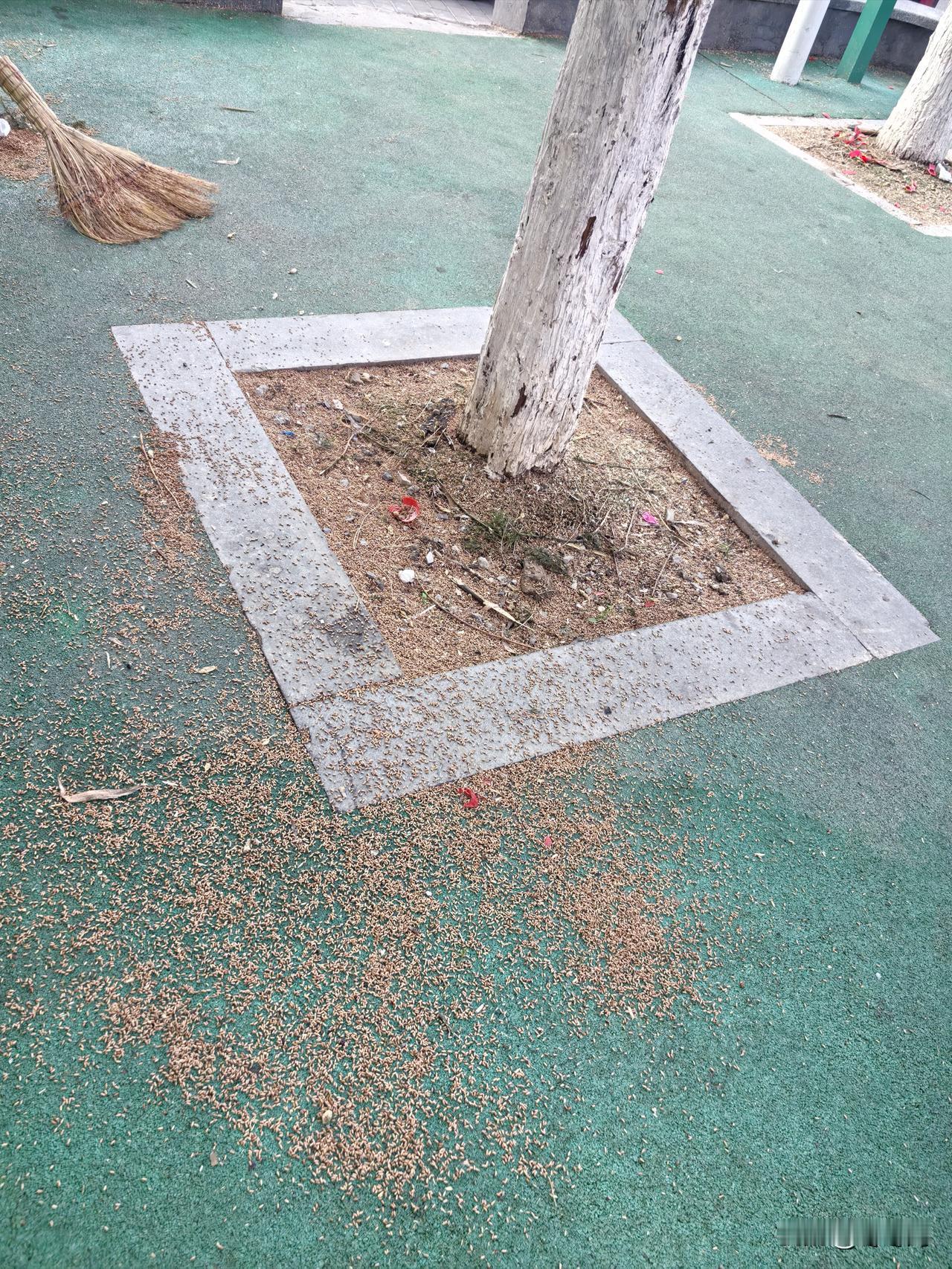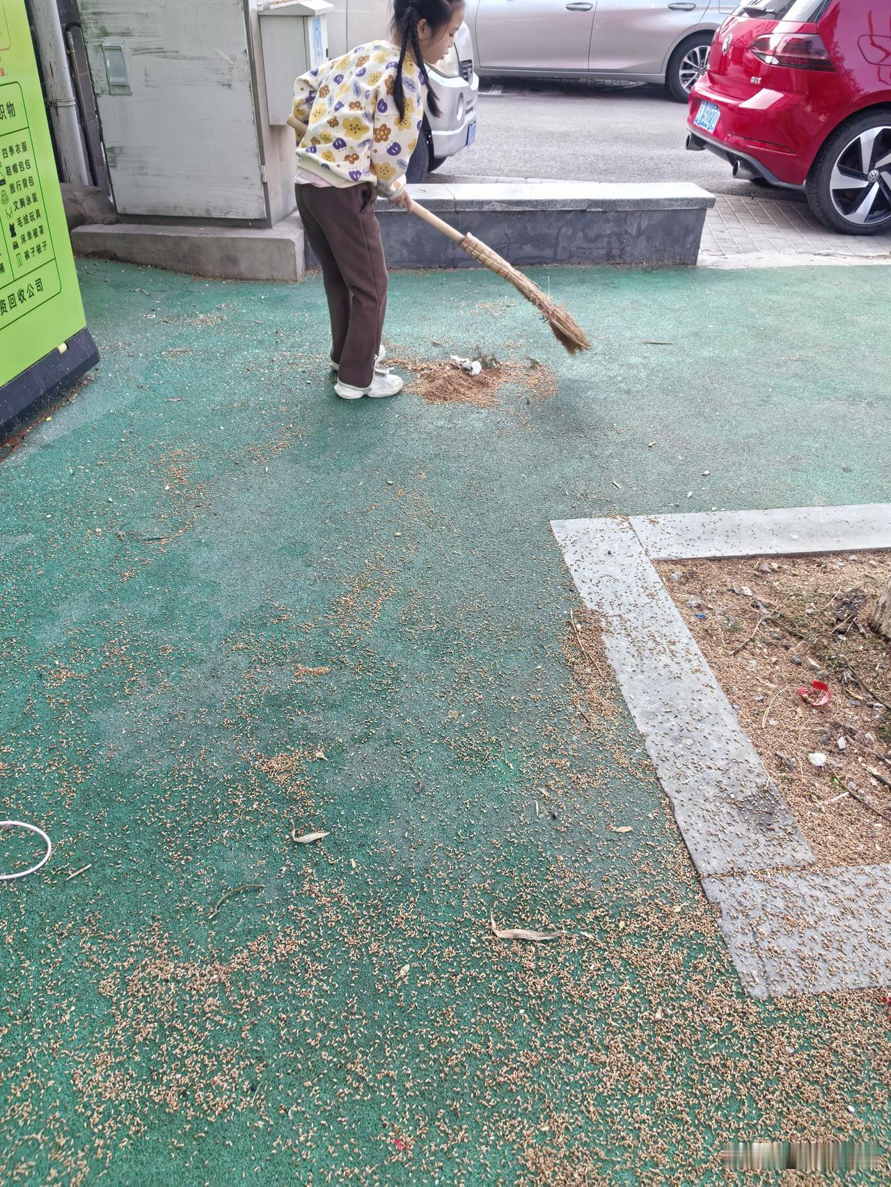 昨天,门头沟大雨后,小区操场的松树底下,落满了散完花粉的花籽,那模样像极了稻谷。小朋友们在操场上嬉笑奔跑,看着这植物残絮杂乱无章的样子,作为一个有洁癖的人,实在难以忍受。于是找了把扫把开始清扫。周边邻居说:“咱这儿本来有保洁,他们半天不来,你这算是帮人家干活了。”我回应道:“这有啥,他赚他的钱,我积我的功德。”