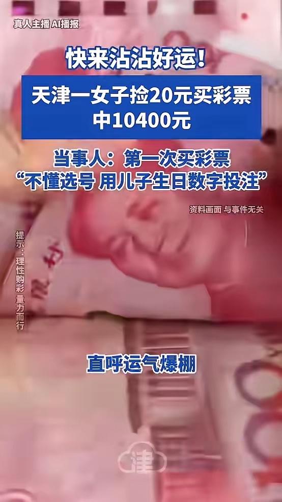近日,天津,一女子外出吃饭时,捡到了20块钱,她一时兴起,用这钱买了张彩票碰运气,因为是第一次买,不懂选号,所以她用了儿子生日,没想到晚上开奖一看,竟然中了10400元大奖!网友:羡慕哭了!