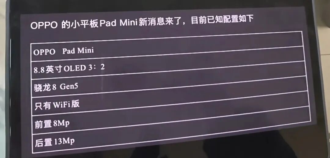 OPPO刚曝光了一个“大杀器”。3月28日,OPPO智能生态产品总监乔家栋在视频里首次秀出了OPPO Pad mini的真机。8.8英寸的小尺寸平板,用上了骁龙8 Gen5——业内第一款。