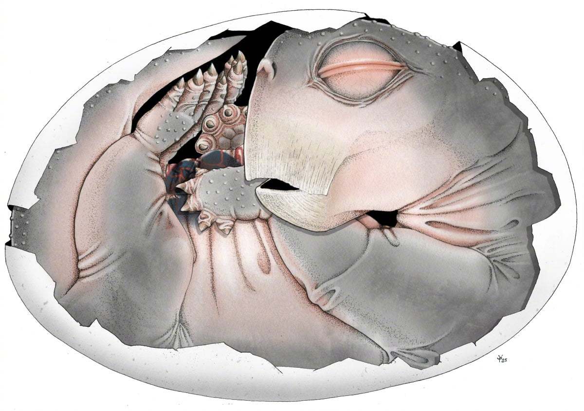 最年幼的那具胚胎嫌疑最大。第一条线索,包着它的岩石结节本身是个椭球,尺寸和蛋对得上。第二条,胚胎蜷着身子卷成蛋里该有的姿势。第三条,骨盆、脊椎根部和肋骨都还散着,软骨连不起来,根本撑不起自己的体重。没破壳的胚胎就该是这样。