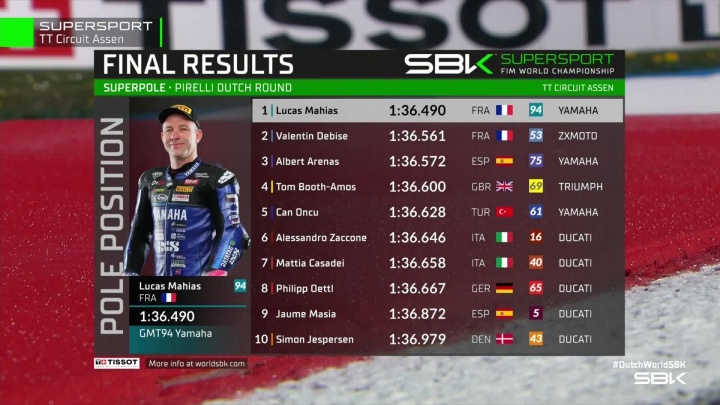 在上轮葡萄牙站的比赛中,德比斯在第一场和第二场正赛中均夺得冠军,张雪机车打破了欧美百年垄断,超级杆位赛德比斯也获得了第二。