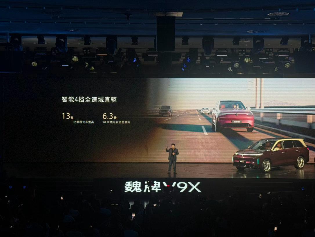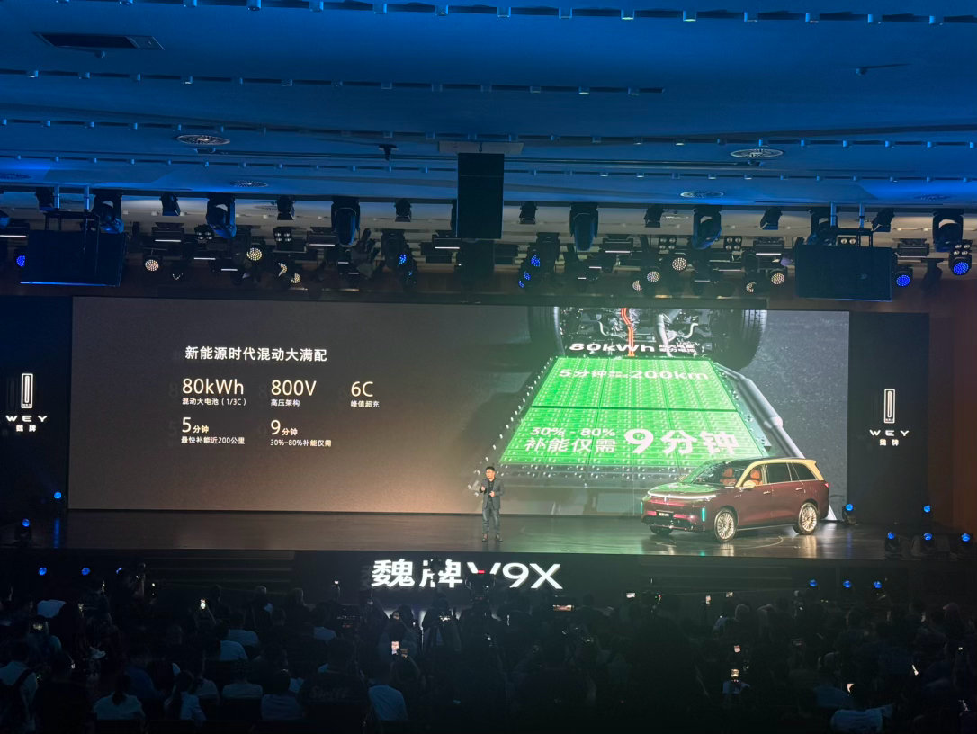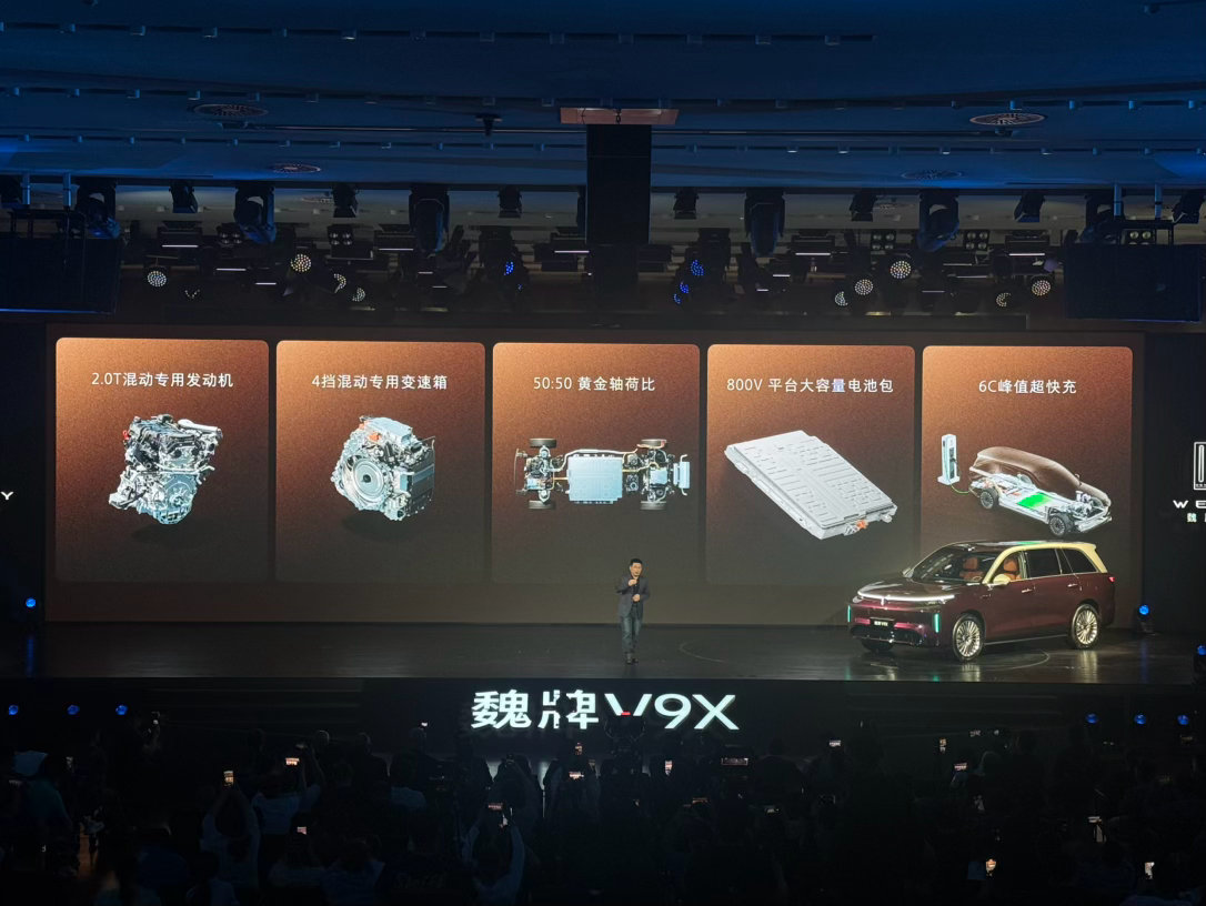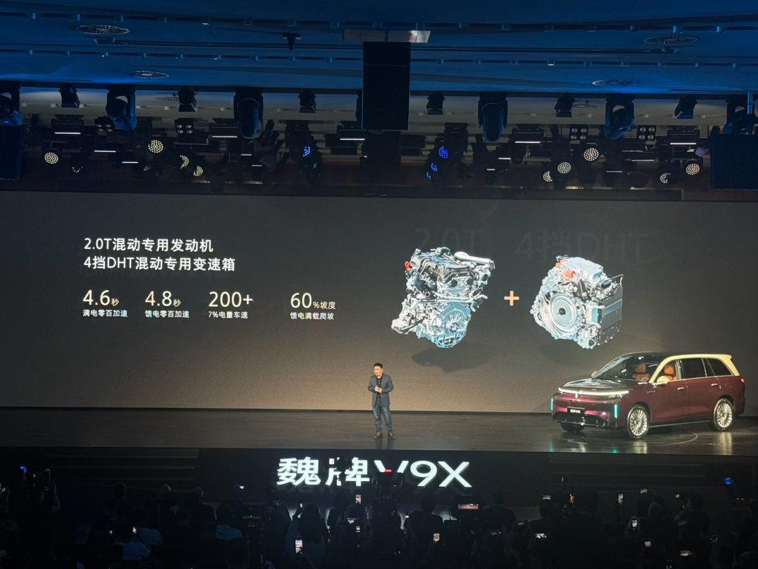 5、动力方面,魏牌V9X搭载超级Hi4,由2.0T发动机与电动机组成插电混动系统,2.0T混动专用发动机最大功率175kW,整体平台基于800V高压平台打造,搭配前后双电机以及4挡混动专用变速箱。满电状态0-100km/h加速时间4.6秒,馈电状态0-100km/h加速时间4.8秒;