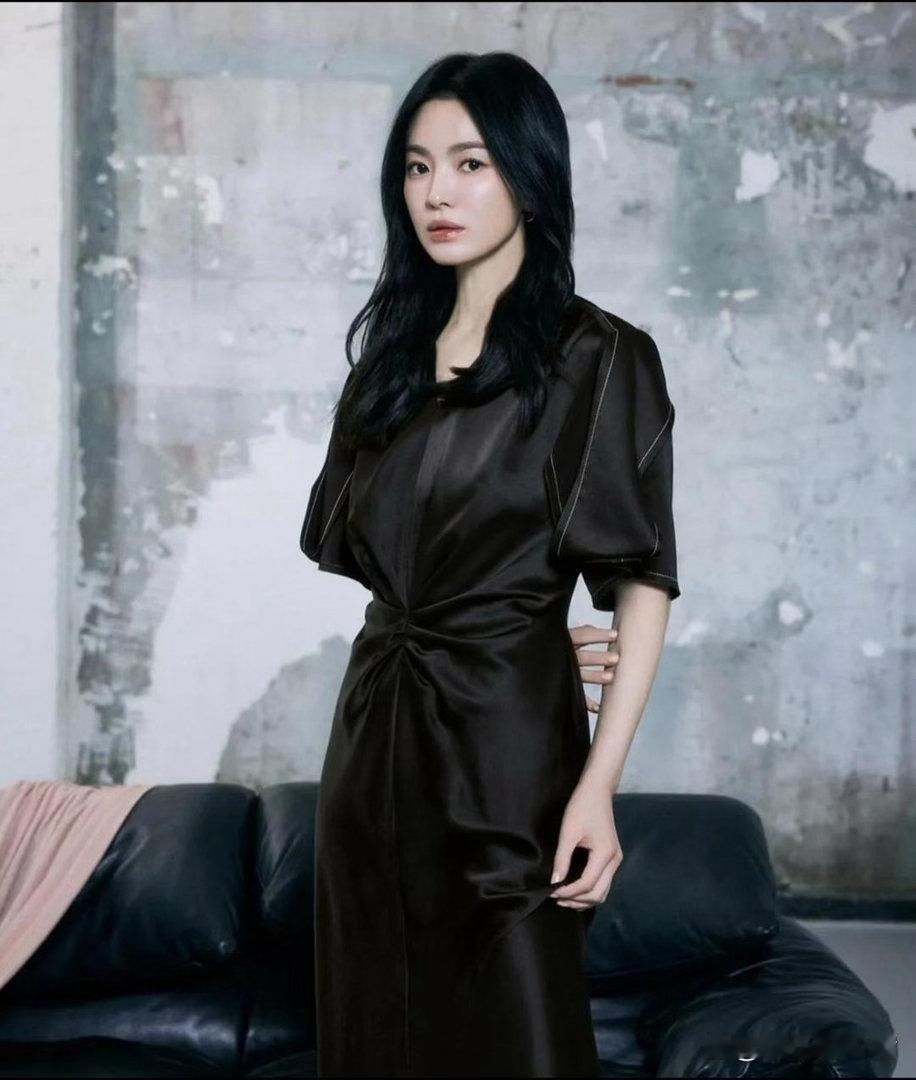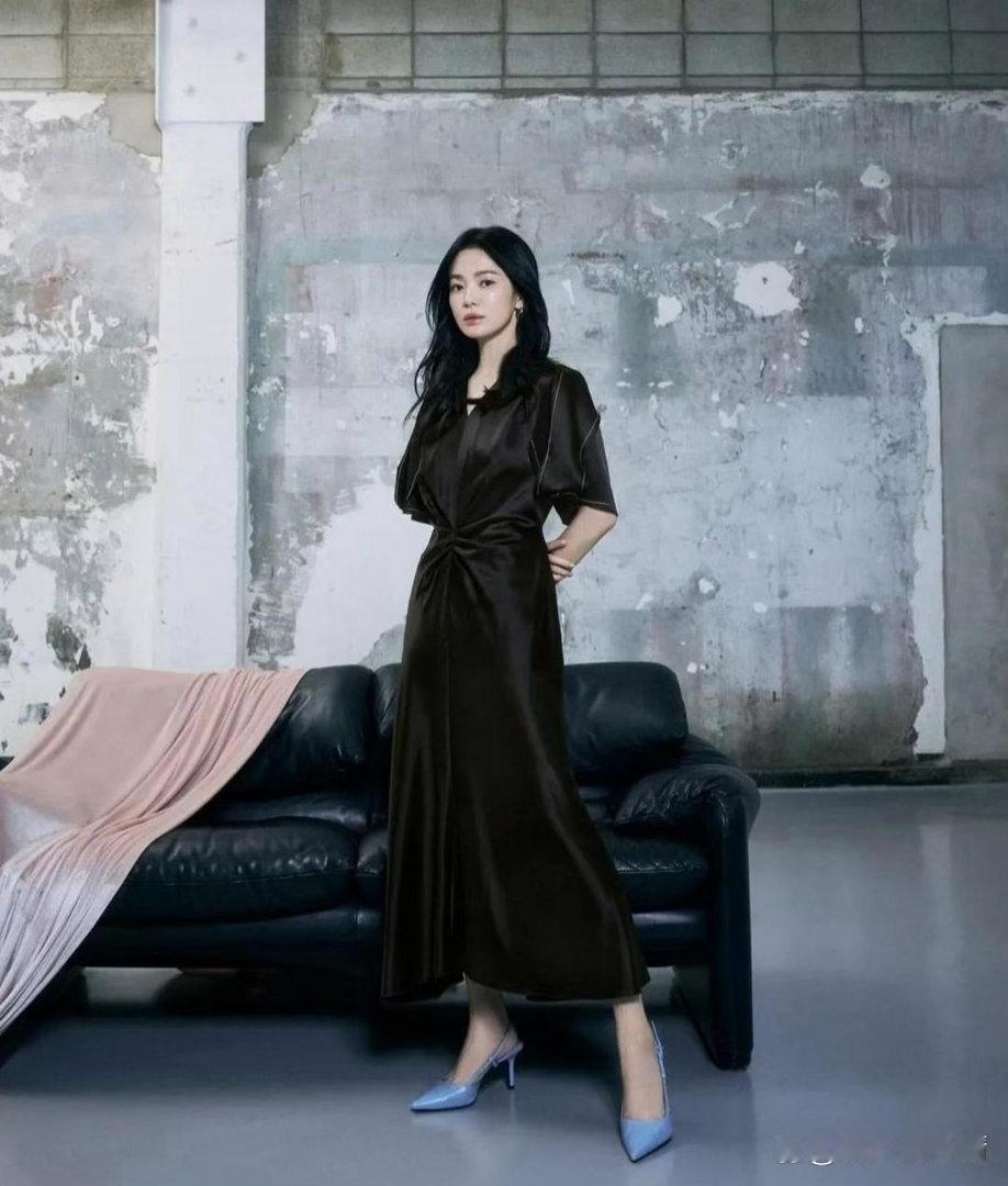 宋慧乔的齐肩卷发慵懒又随性,深棕色缎面连衣裙质感高级、垂坠感拉满,整个人贵气又温