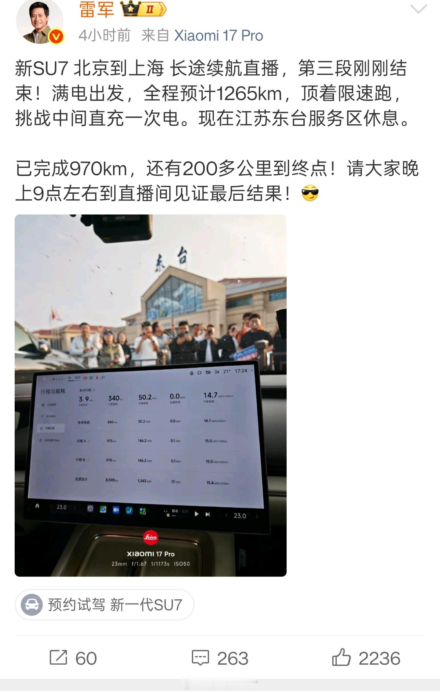 那个中途得充两次的老印象,这回是真的要翻篇了,当一个企业总裁,还在用“最笨”的办法亲自跑长途来验证一件事的时候,这事儿就靠谱的不能再靠谱了。雷军达成京沪高速只充一次电