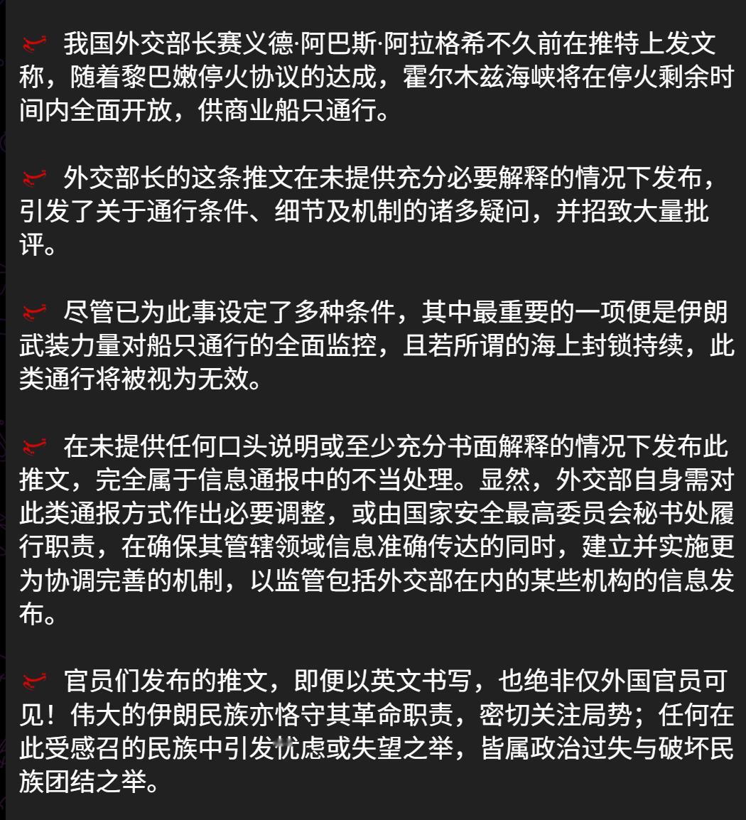🔻与伊朗革命卫队关系密切的塔斯尼姆通讯社在公布了“伊朗为霍尔木兹海峡的船只通行设定了三项条件”后,批评伊朗外长阿格拉奇“推文内容糟糕且不完整,关于霍尔木兹海峡重新开放的问题存在不当的模糊表述,在未提供任何口头说明或至少充分书面解释的情况下发布此推文,完全属于信息通报中的不当处理,显然,外交部自身需对此类通报方式作出必要调整”。🔻这措辞很严厉啊霍尔木兹海峡开放以宣布基本解除战时限制海外新鲜事中东现场直击